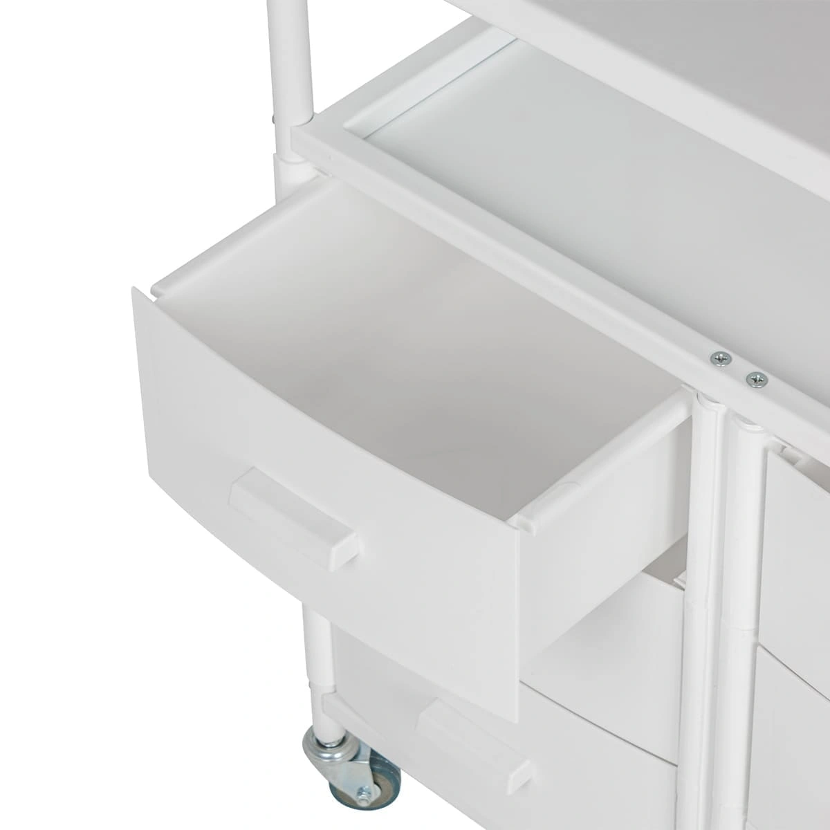 Для инструментов, аксессуаров и расходных материалов достаточно места в шести выдвижных ящиках. Полки можно использовать как для необходимых приспособлений, так и для установки небольших аппаратов. Несомненным плюсом косметологического оборудования являются встроенные маневренные колесики. Мастер без особых усилий может перемещать косметологическую тележку по рабочей зоне.