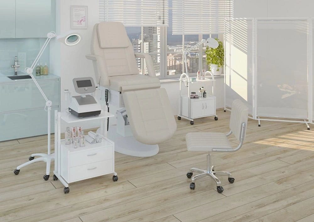 Каркас косметологического кресла изготовлен из металла, покрытого порошковой защитной краской. Основание закрыто декоративной накладкой из прочного пластика. В нижней части предусмотрены подпятники, которые защитят напольное покрытие от царапин. Мягкая часть кресла – наполнитель из упругого поролона и тактильно приятная обшивка из экокожи.