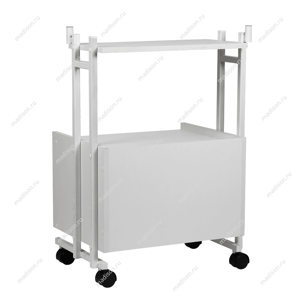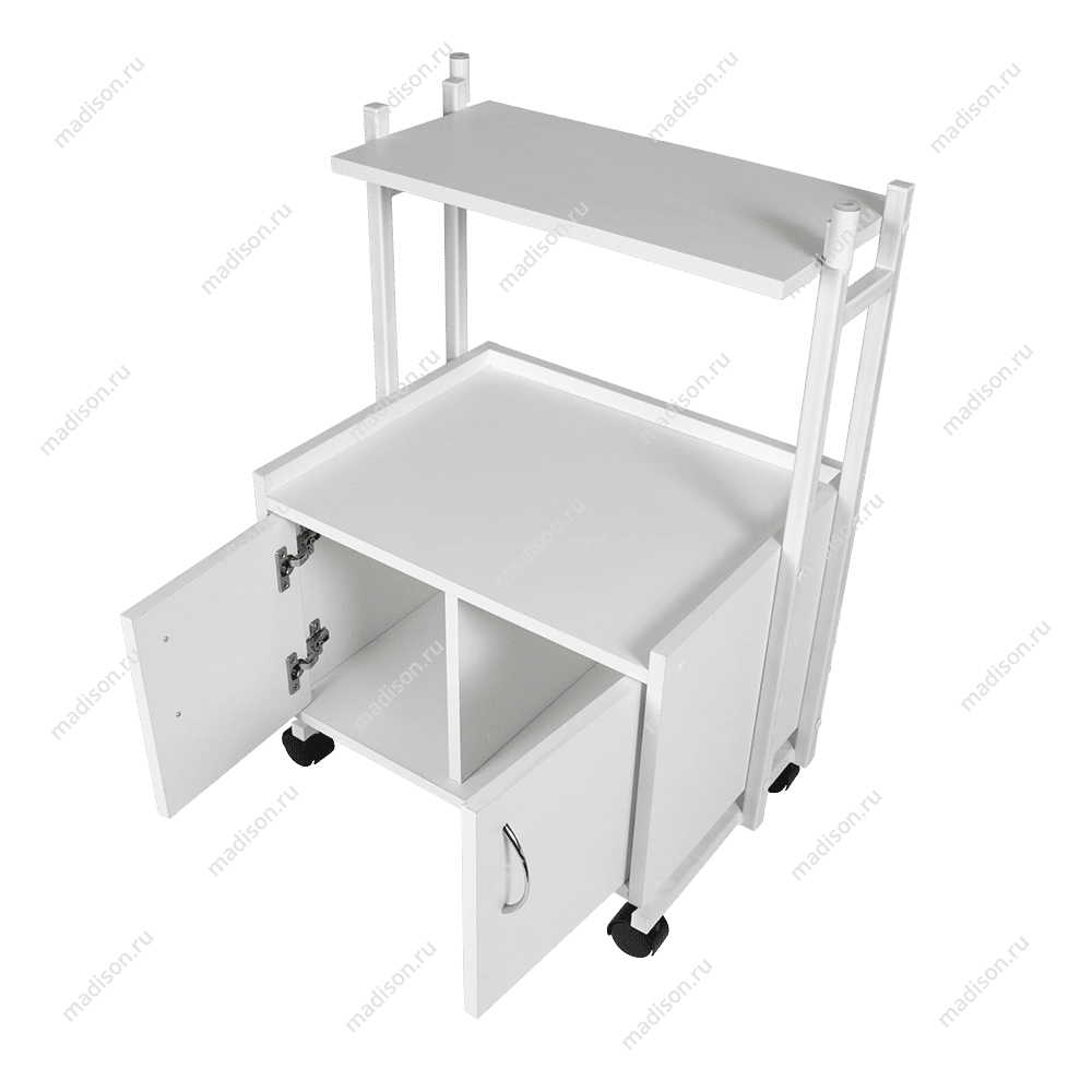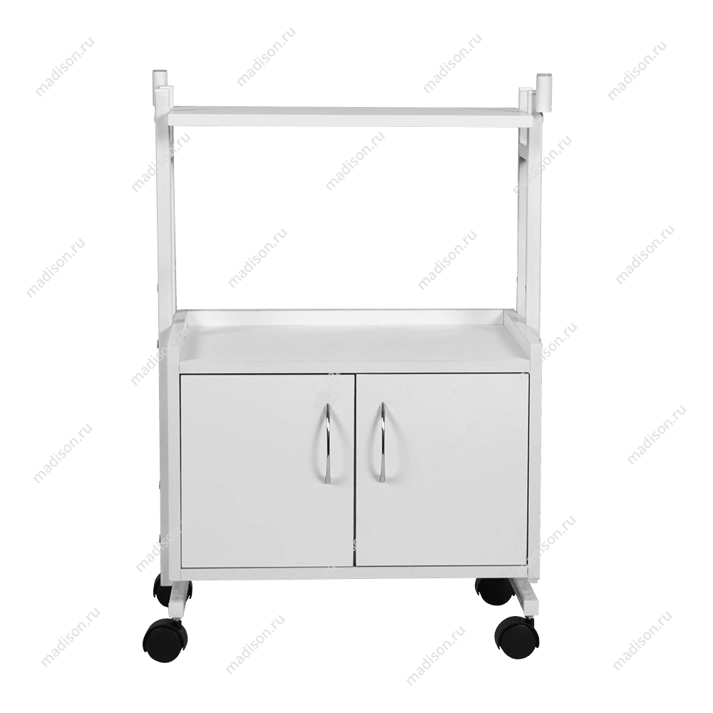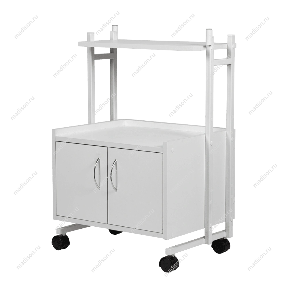 Каркас тележки – прочная сталь, покрытая белой порошковой краской с антикоррозийными свойствами. Основа установлена на вращающиеся колеса, благодаря которым тележку легко перемещать по рабочей площади. На верхней полке косметологического оборудования мастер может разложить инструменты и материалы, использующиеся во время процедур. Полочка и шкафчик изготовлены из ламинированной ДСП.