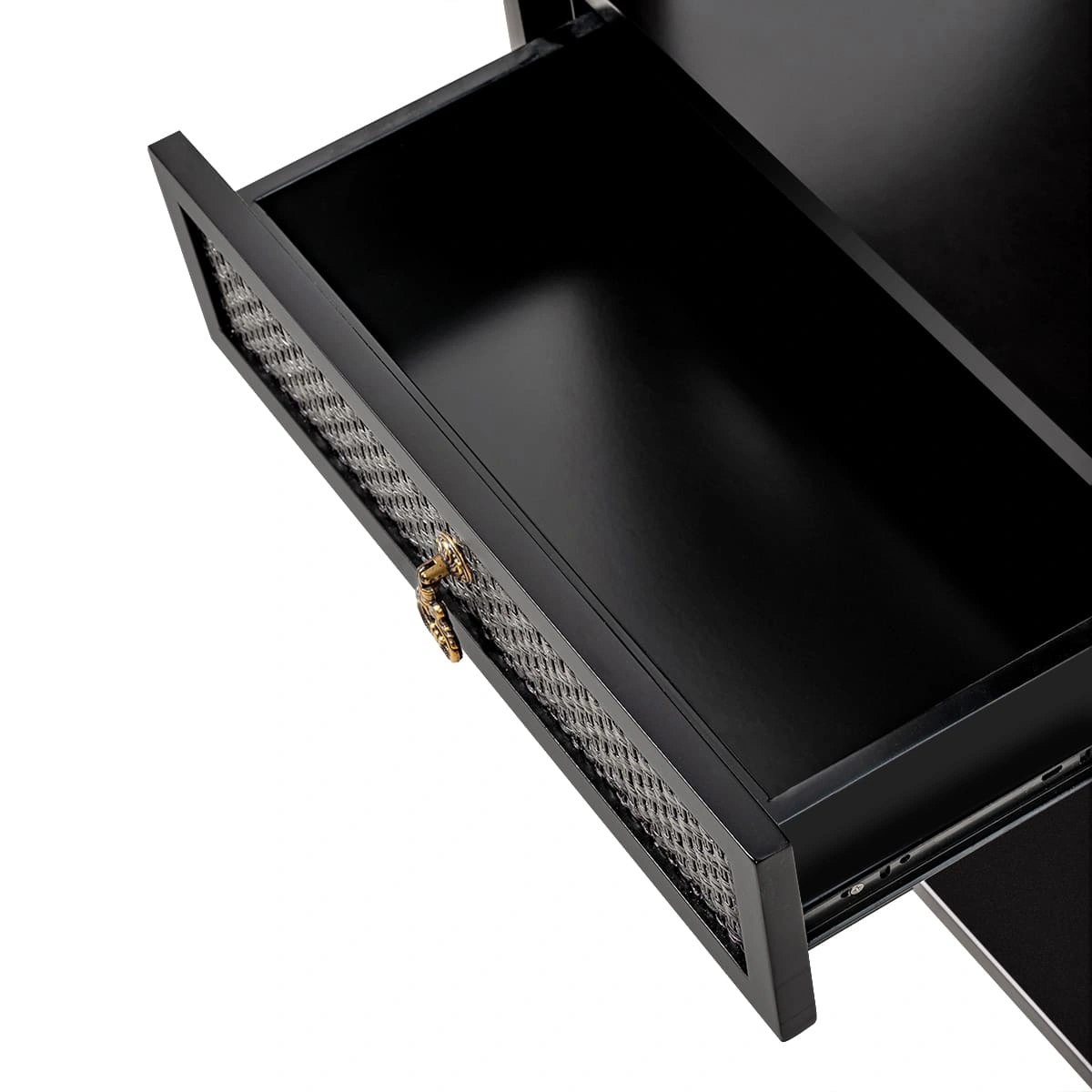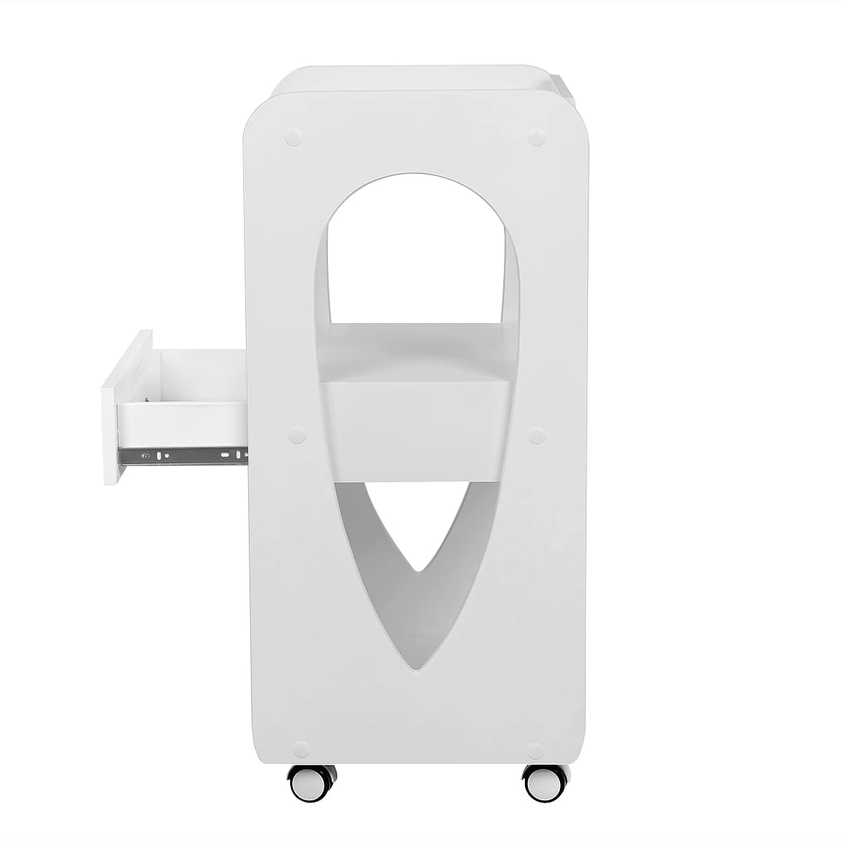 Конструкция столика не сложная, но продуманная и функциональная. Три открытые полки расположены на разных уровнях, где мастер может удобно расположить все необходимое оборудование при проведении косметологических или СПА-процедур. По центру находится небольшой выдвижной ящик с красивой декоративной накладкой и изящной ручкой. В ящике можно хранить расходные материалы и аксессуары, которые не хочется оставлять на виду. Благодаря тому, что высота ящика небольшая, расстояние между полками значительно увеличивается, и на них можно разместить высокие средства для СПА-процедур, или небольшую косметологическую технику. Самая верхняя полка оснащена бортиками с трех сторон, которые защищают от падения расположенные на ней инструменты.