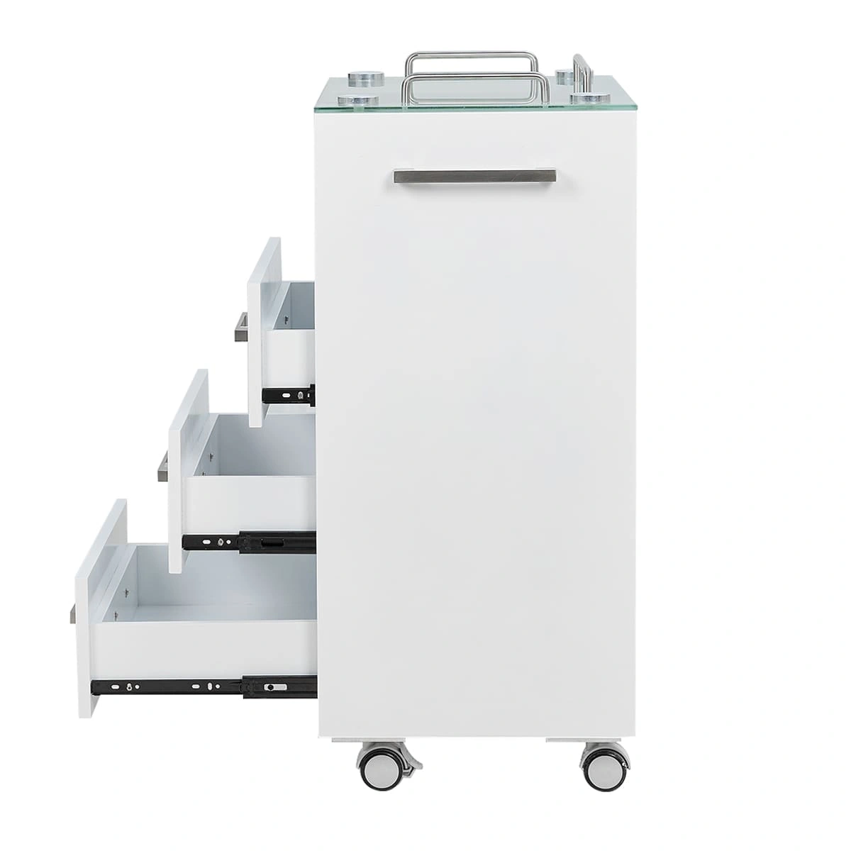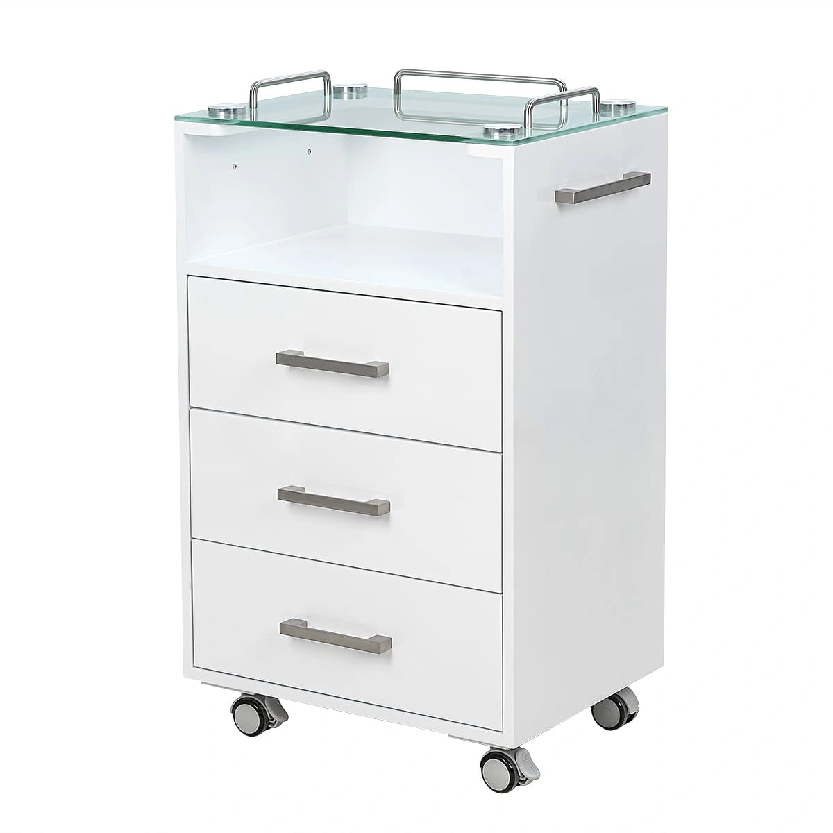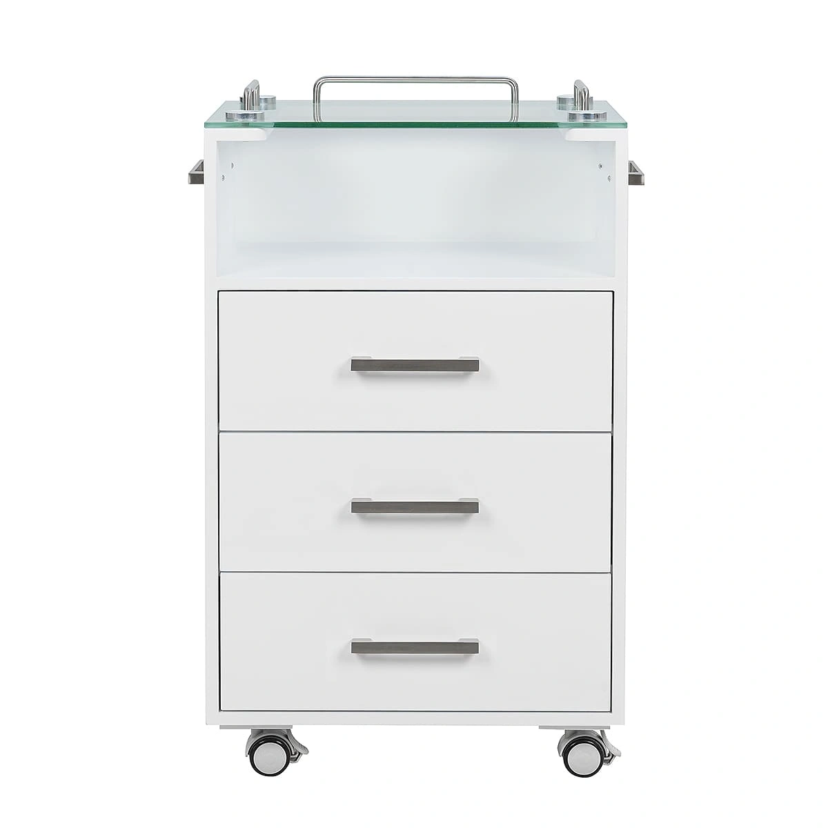 Комплектация: стеклянная верхняя полка с хромированными бортиками, 3 выдвижных ящика и 1 полка, ручки по бокам тумбы, 4 опорных колеса, двойные, съемные, 2 передних со стопами.