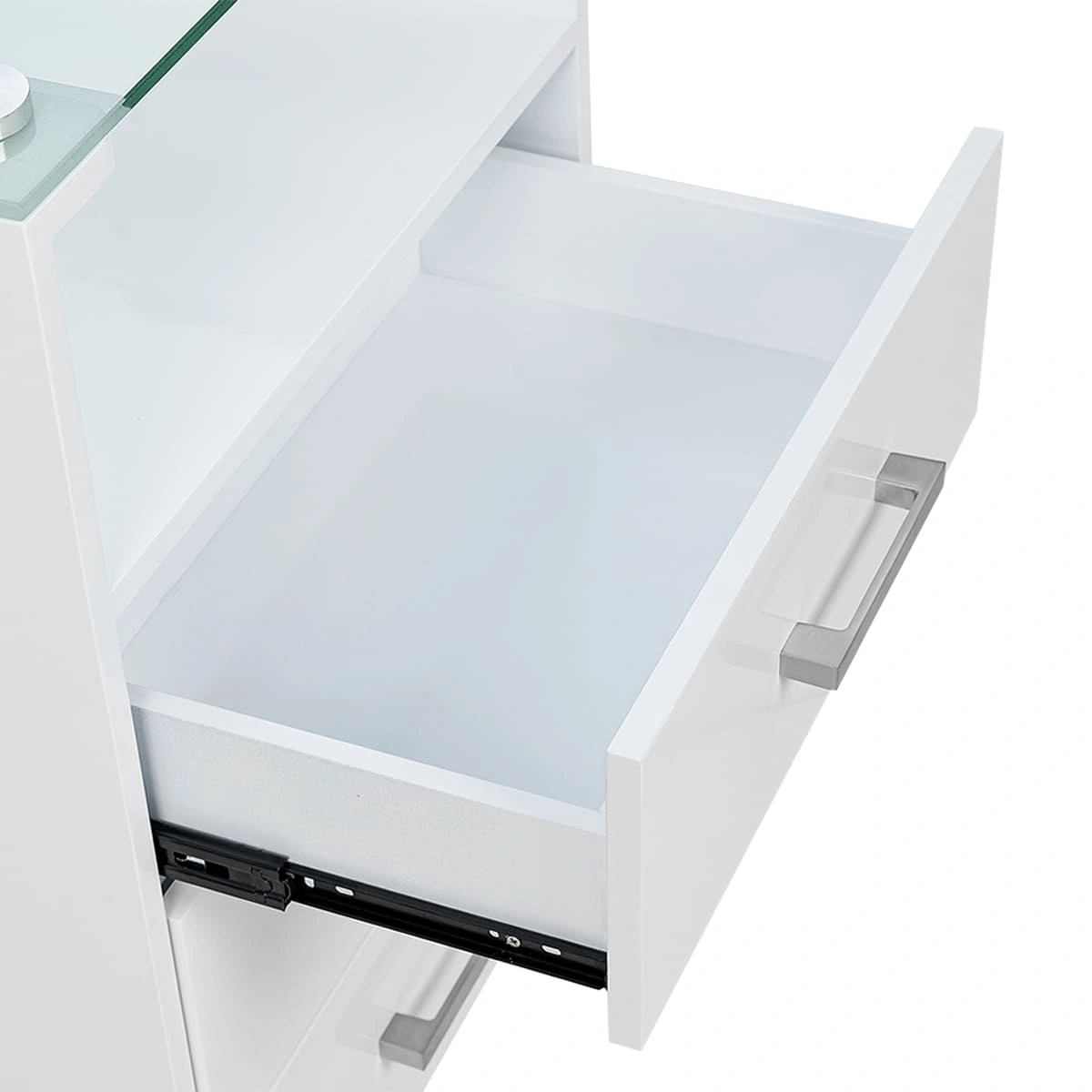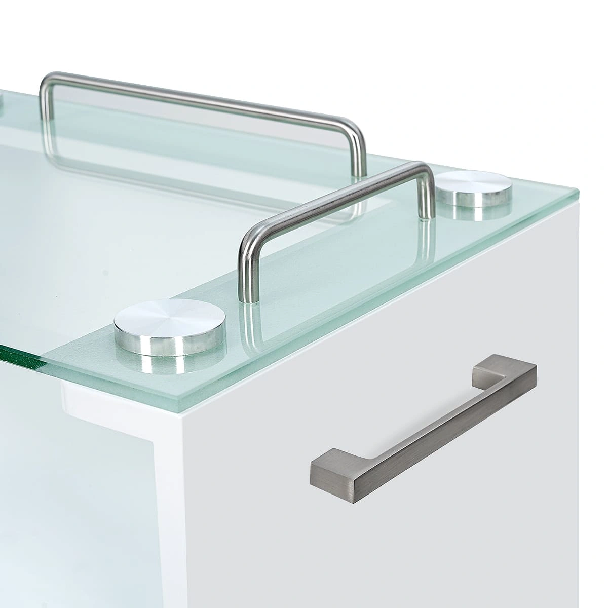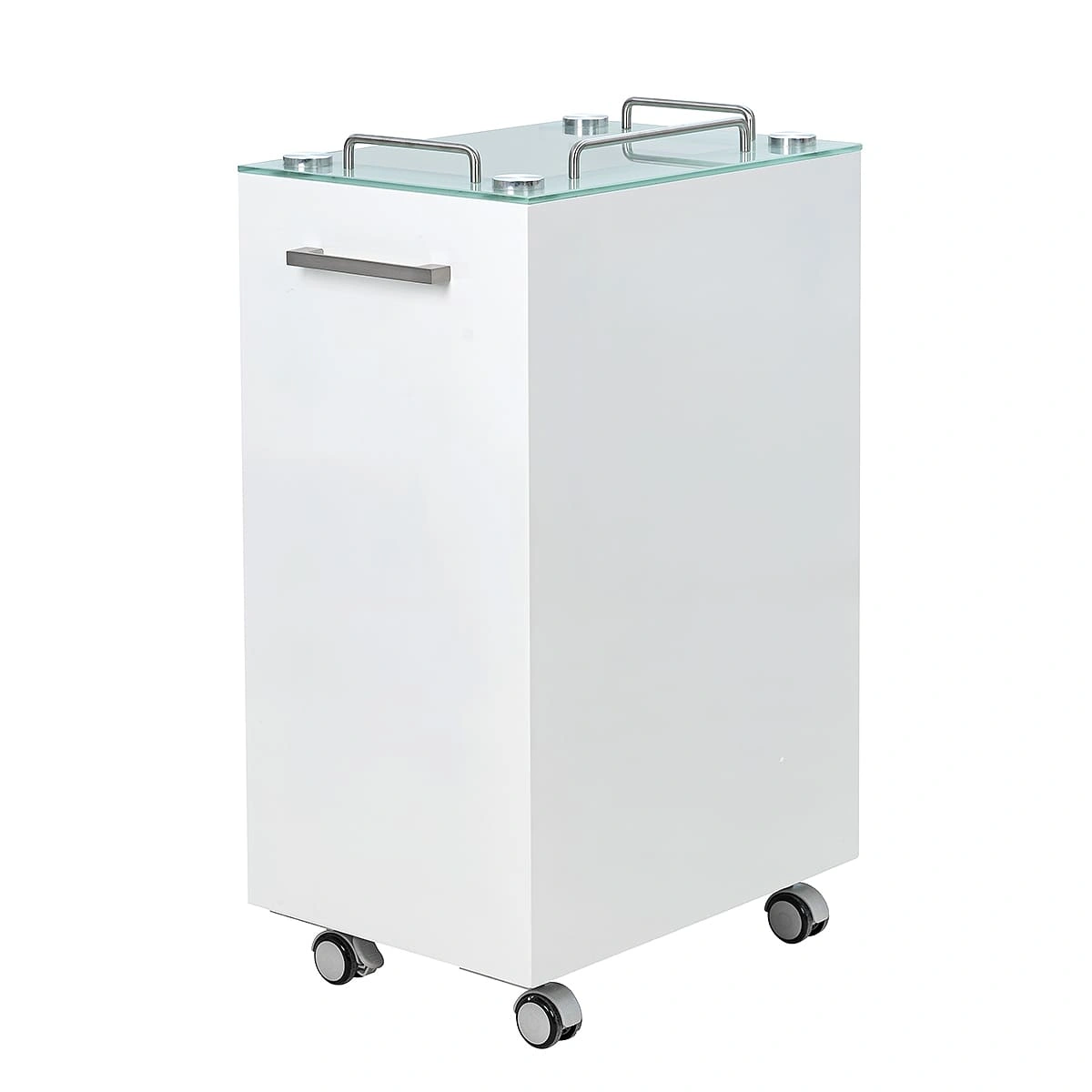 Комплектация: стеклянная верхняя полка с хромированными бортиками, 3 выдвижных ящика и 1 полка, ручки по бокам тумбы, 4 опорных колеса, двойные, съемные, 2 передних со стопами.