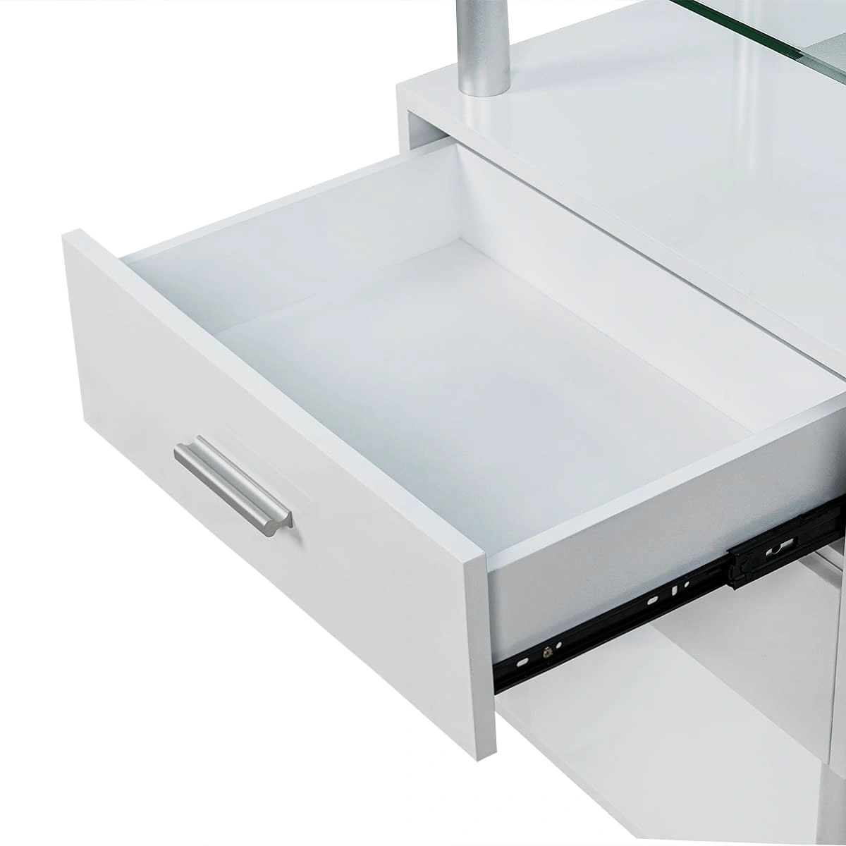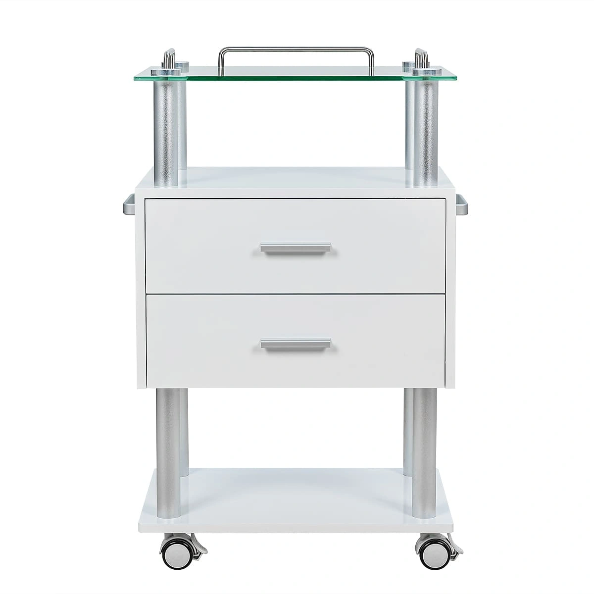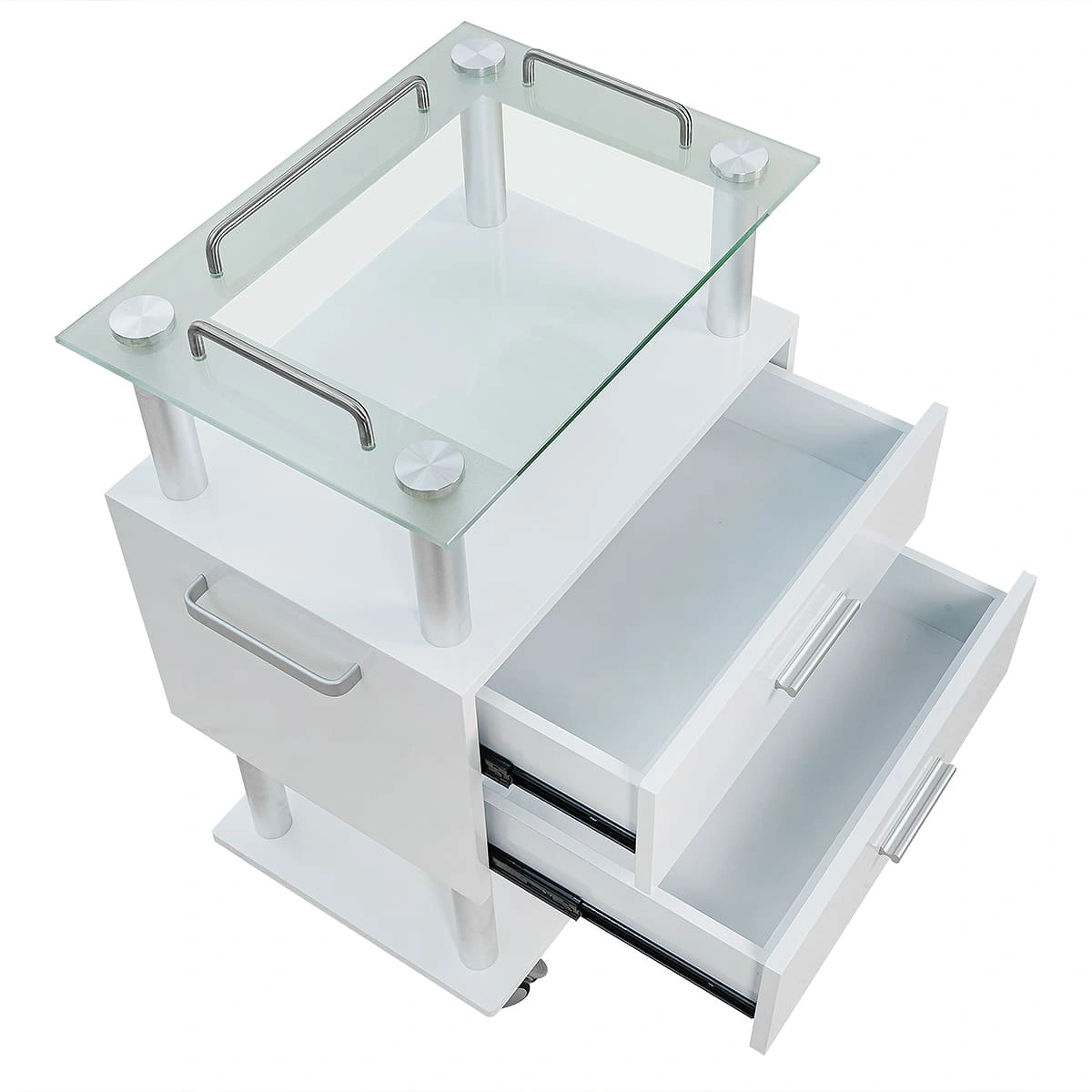Тумбочка состоит из каркаса в виде хромированных труб, внизу и вверху расположены две открытые полки, на которых мастер может удобно разместить инструменты и принадлежности, исходя из своих предпочтений и проводимой процедуры. Для расходных материалов и аксессуаров между полками находятся два закрытых вместительных ящика. Сверху столика размещена стеклянная полка с хромированными бортиками, которые защищают хранящиеся на столике предметы от падения.