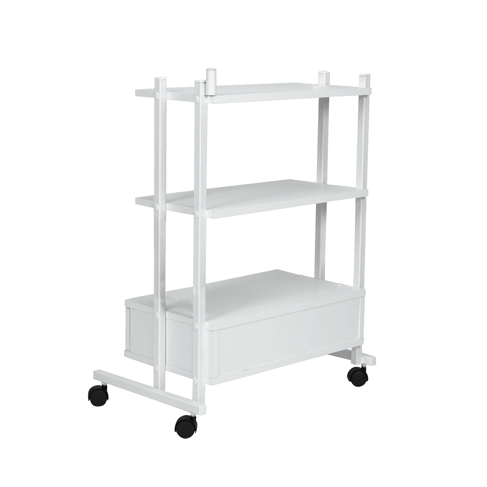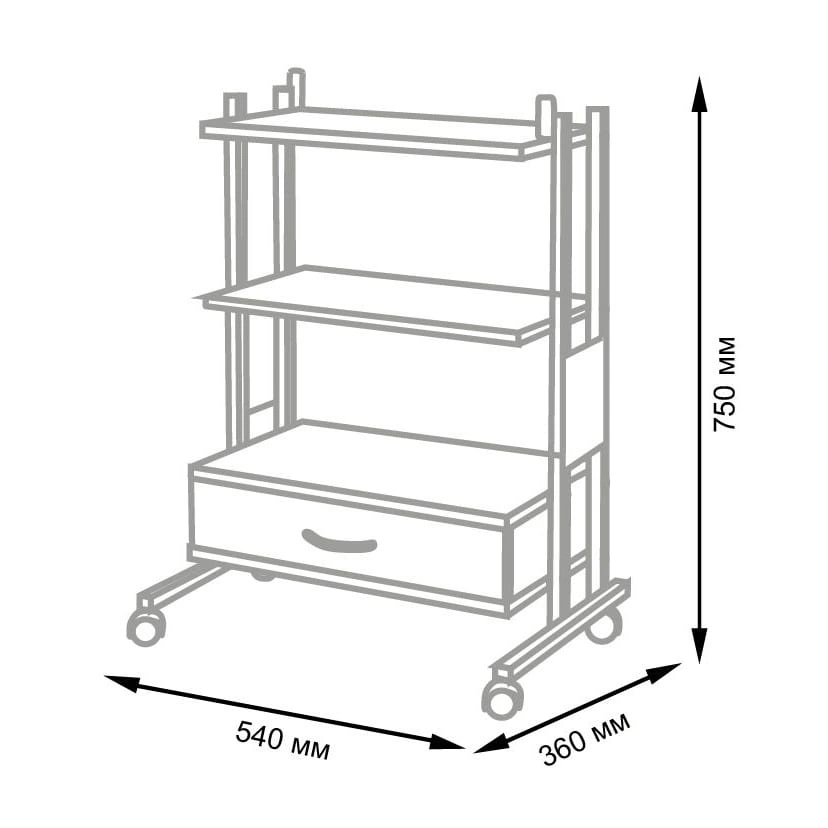 Комплектация: металлический каркас, три полки, выдвижной ящик, колеса.