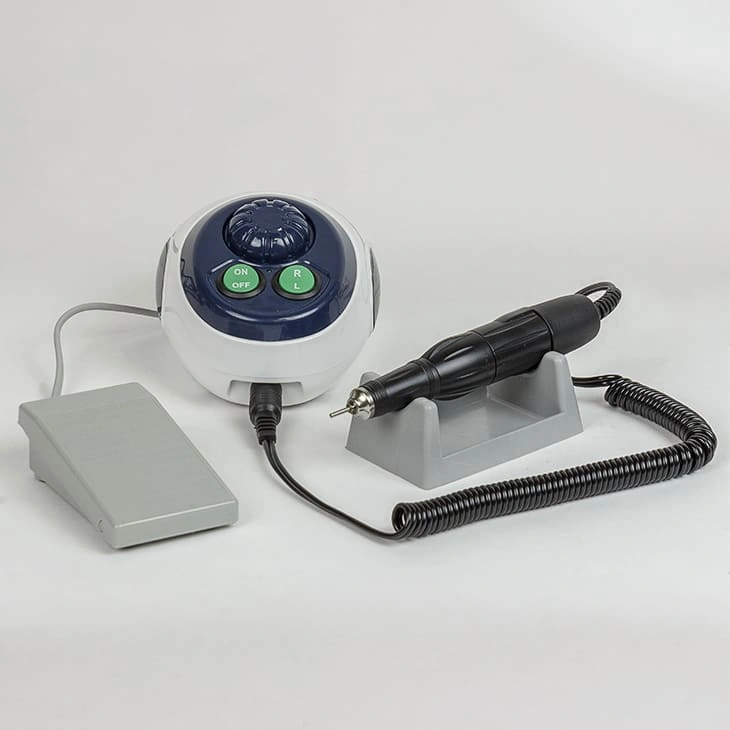 Устройство состоит из блока из питания, ручки с микромотором и подставки. Для ручки предусмотрена отдельная подставка. Ножная педаль предусмотрена для включения и выключения. Кнопкой реверса удобно менять направление вращения. Компактное оборудование можно сложить в стильную сумочку и взять с собой для выездной работы.