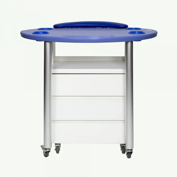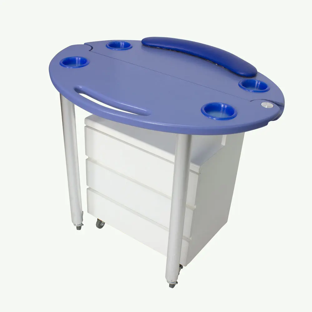 Стол маникюрный МД-9007 (раздвижной) с вместительной тумбой на колесах и хромированными ножками. Он позволяет максимально использовать пространство помещения, что очень важно при минимальной площади рабочего кабинета или для работы на дому. Круглая столешница состоит из двух частей, которые соединены металлическим креплением. В каждой части предусмотрено по два отверстия с пластиковыми емкостями для хранения различных расходных материалов, аксессуаров и прочих рабочих принадлежностей. Для изготовления столешницы применяется ДСП с ламинированным покрытием приятного синего цвета.