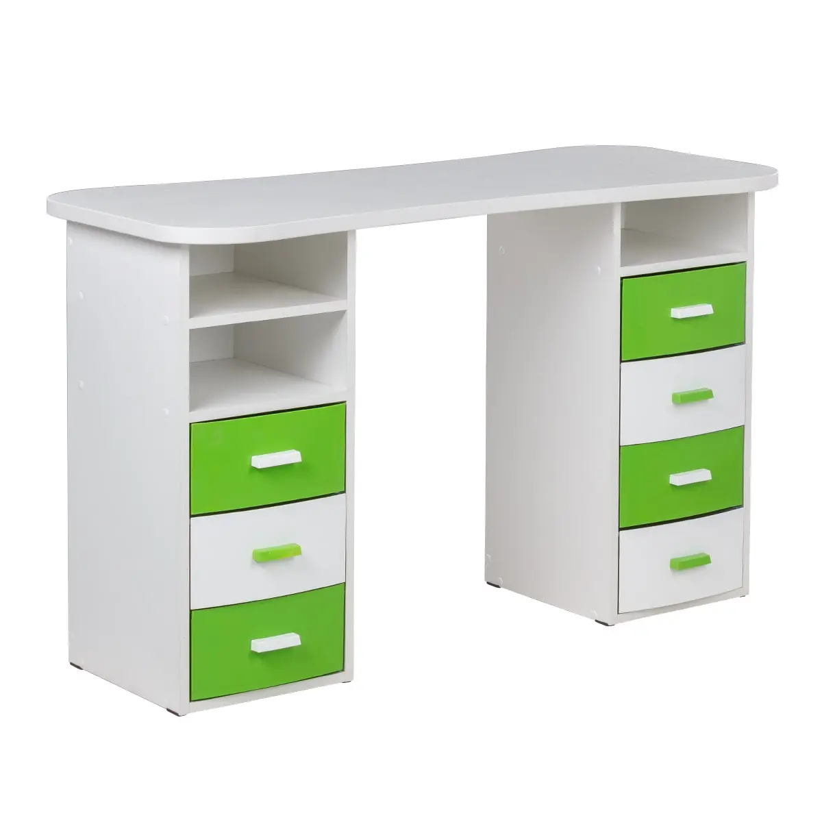 Корпус тумбы, полки и столешница маникюрного стола выполнены из ЛДСП высокого качества. Кромка из ПВХ надежно защищает торцы маникюрного стола от сколов и проникновения влаги. Специальные подпятники не допустят царапин на полу. Ящики из прочного пластика не бояться легкого механического воздействия и влияния моющих средств. Можно заказать разные комбинации расцветок ящиков из доступных цветов.