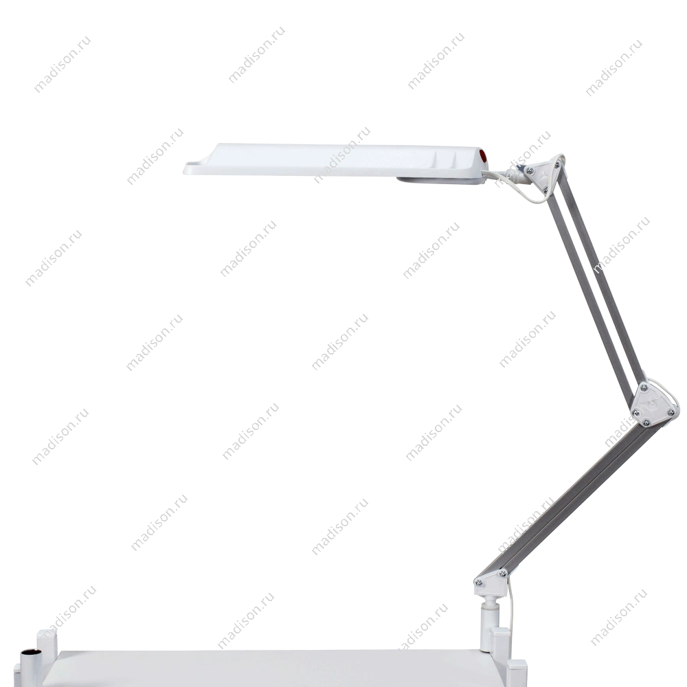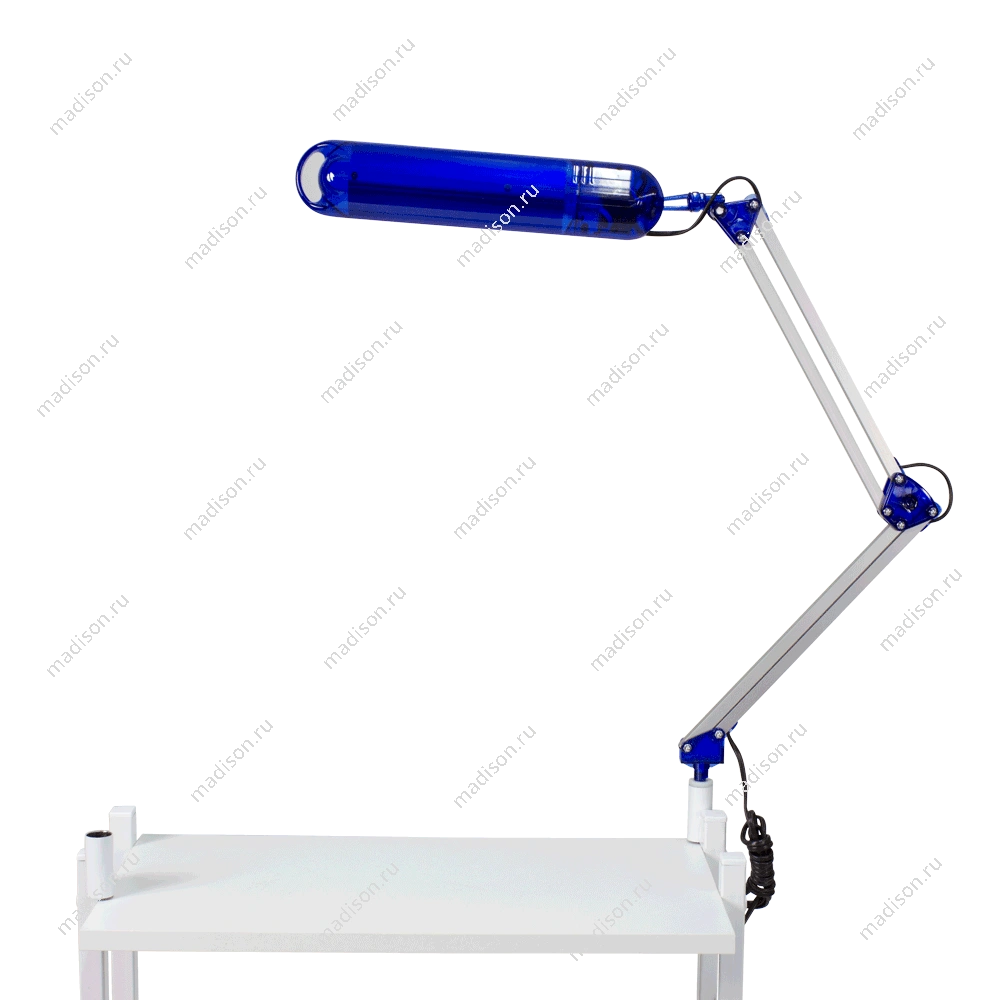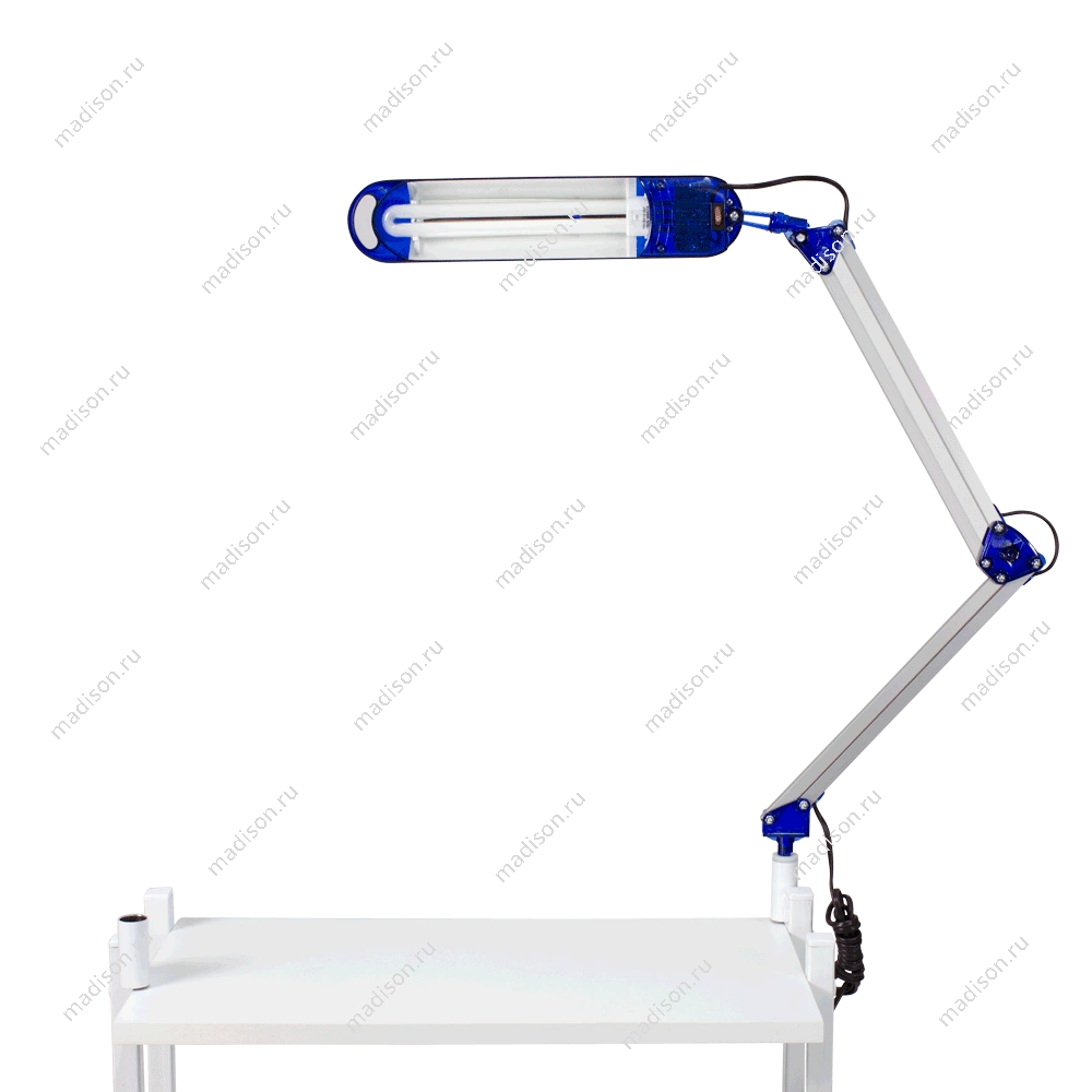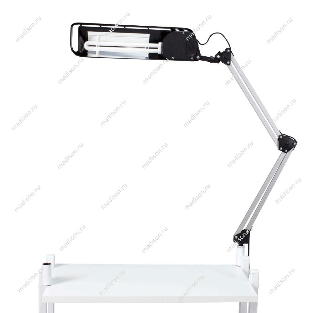 Настольная лампа крепится к поверхности с помощью струбцины черного цвета. При этом толщина стола не должна превышать 25 мм. Оборудование имеет компактные размеры и не занимает пространства рабочей зоны стола. Сменная люминесцентная лампа имеет длительный срок службы и дает качественный рассеянный свет. Она не напрягает зрение и позволяет рассмотреть даже самые мелкие детали. Работает данное устройство от бытовой сети с напряжением 220 В и имеет мощность 11 Вт. Удобная и практичная лампа маникюрная от магазина МЭДИСОН идеально подойдет для работы в кабинете и домашнего использования. Для гармоничности дизайна рабочего места в одном цветовом решении с лампой можно приобрести подставку под лаки и маникюрную подушку.