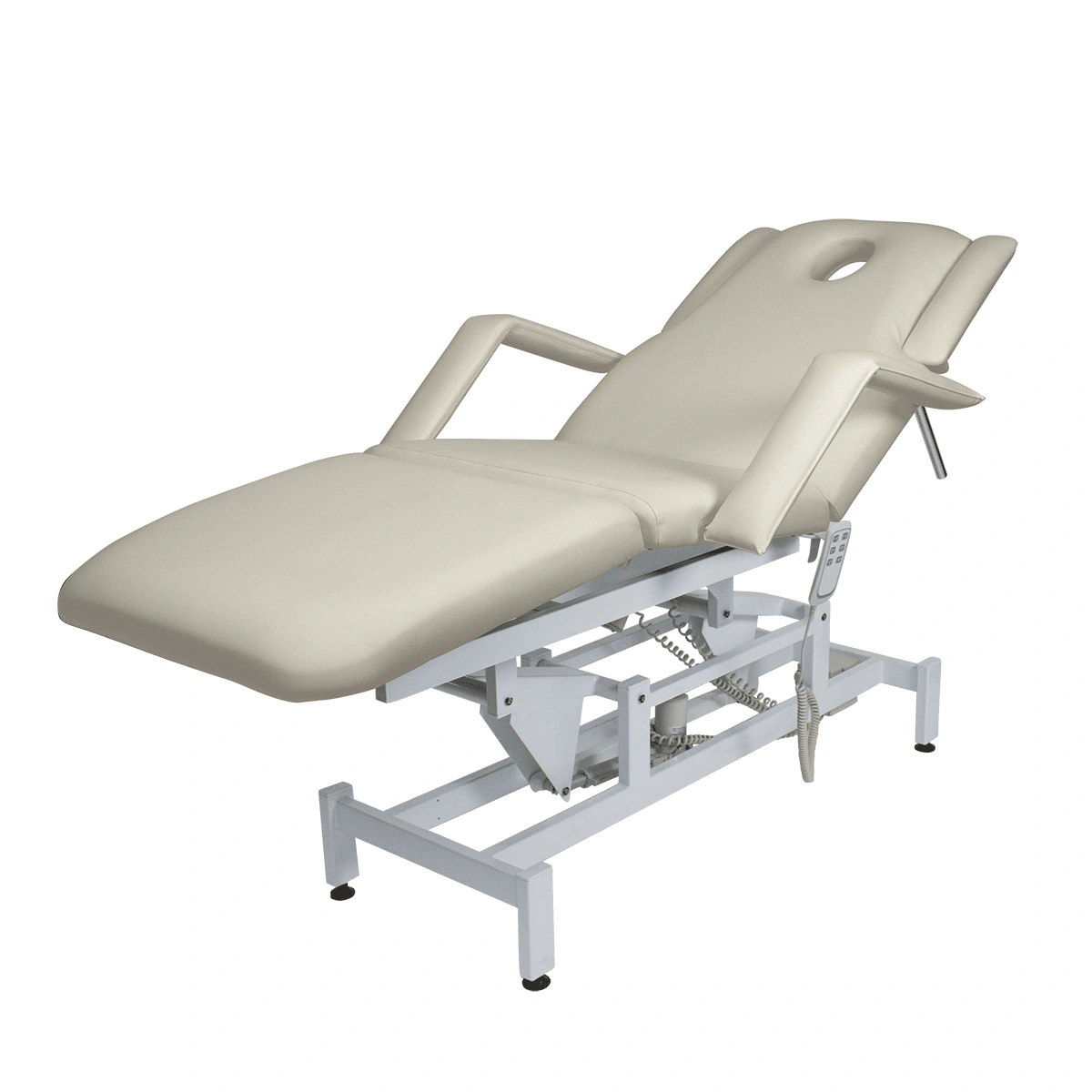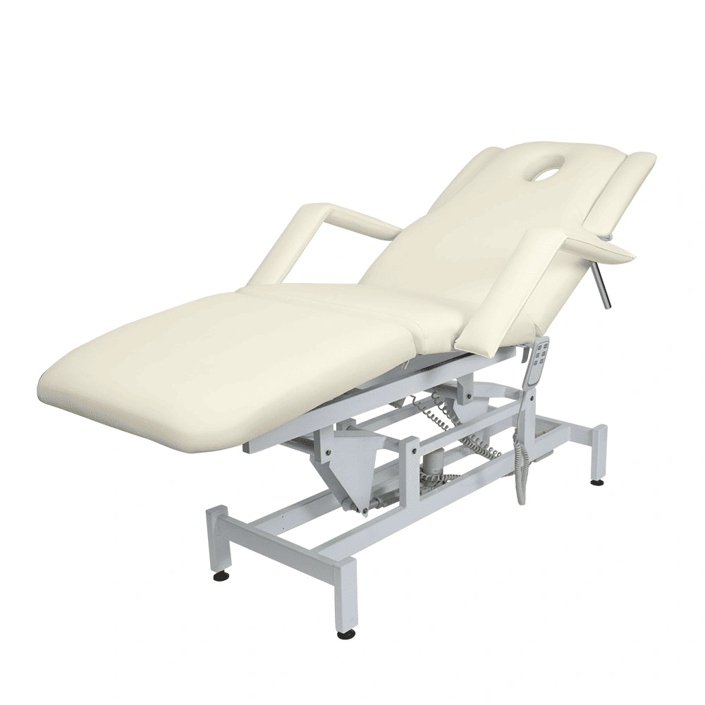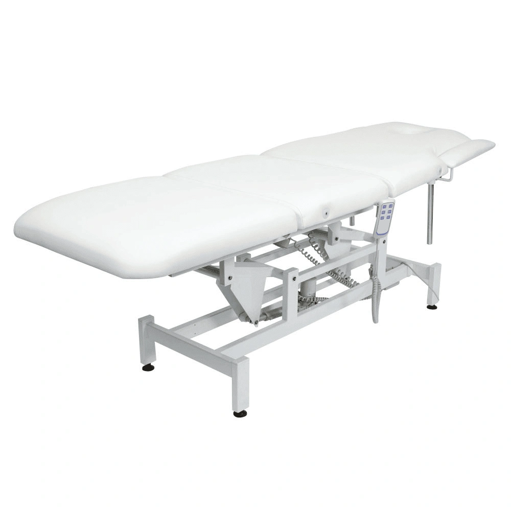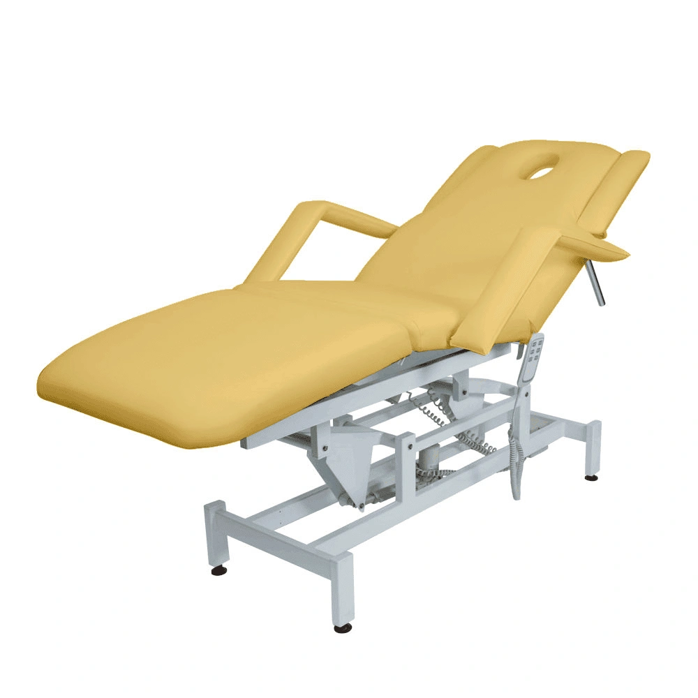 Кушетка массажная МД-849 (Элегия-3А) (электропривод, 3 мотора) – это профессиональное оборудование от компании МЭДИСОН. Она разработана для применения в массажном или косметологическом кабинете высокого уровня. Мягкая часть кушетки разделена на три сегмента: сиденье, спинка, элемент для ног. Это значительно повышает комфорт при использовании и обеспечивает необходимую функциональность во время работы. В спинке есть специальный вырез для лица. Для удобного расположения рук по время массажа предусмотрены навесные подлокотники, регулируемые по высоте. Размеры кушетки: