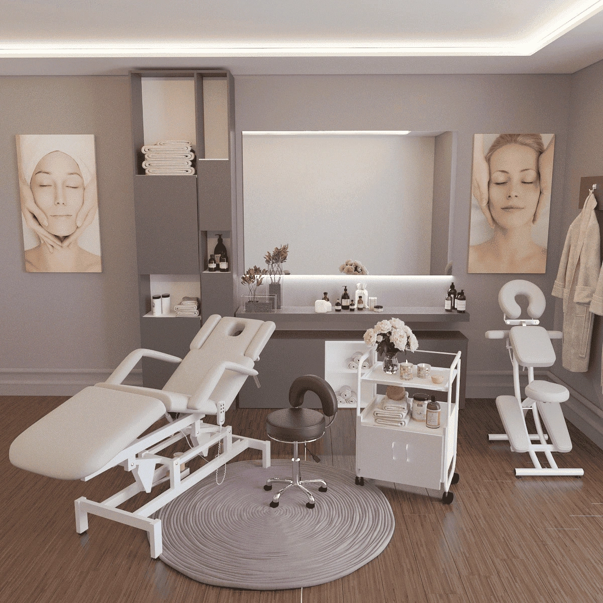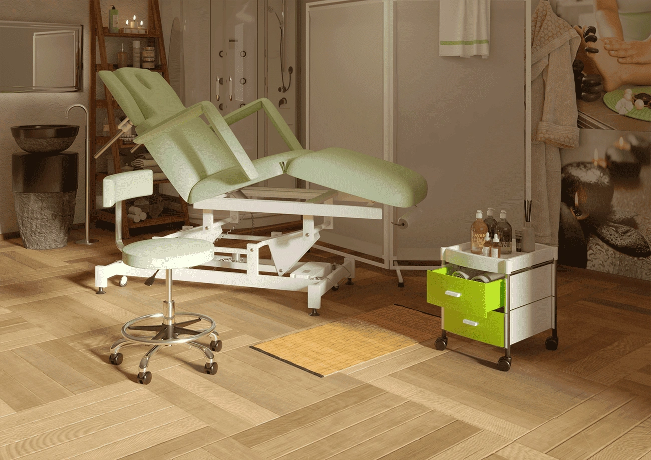 Вы можете заказать кушетку на подпятниках (стандартная комплектация) или на колесной баз.