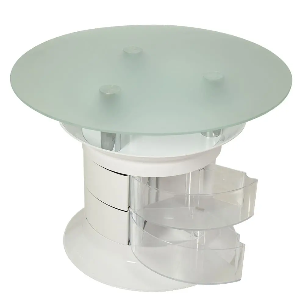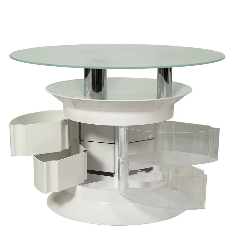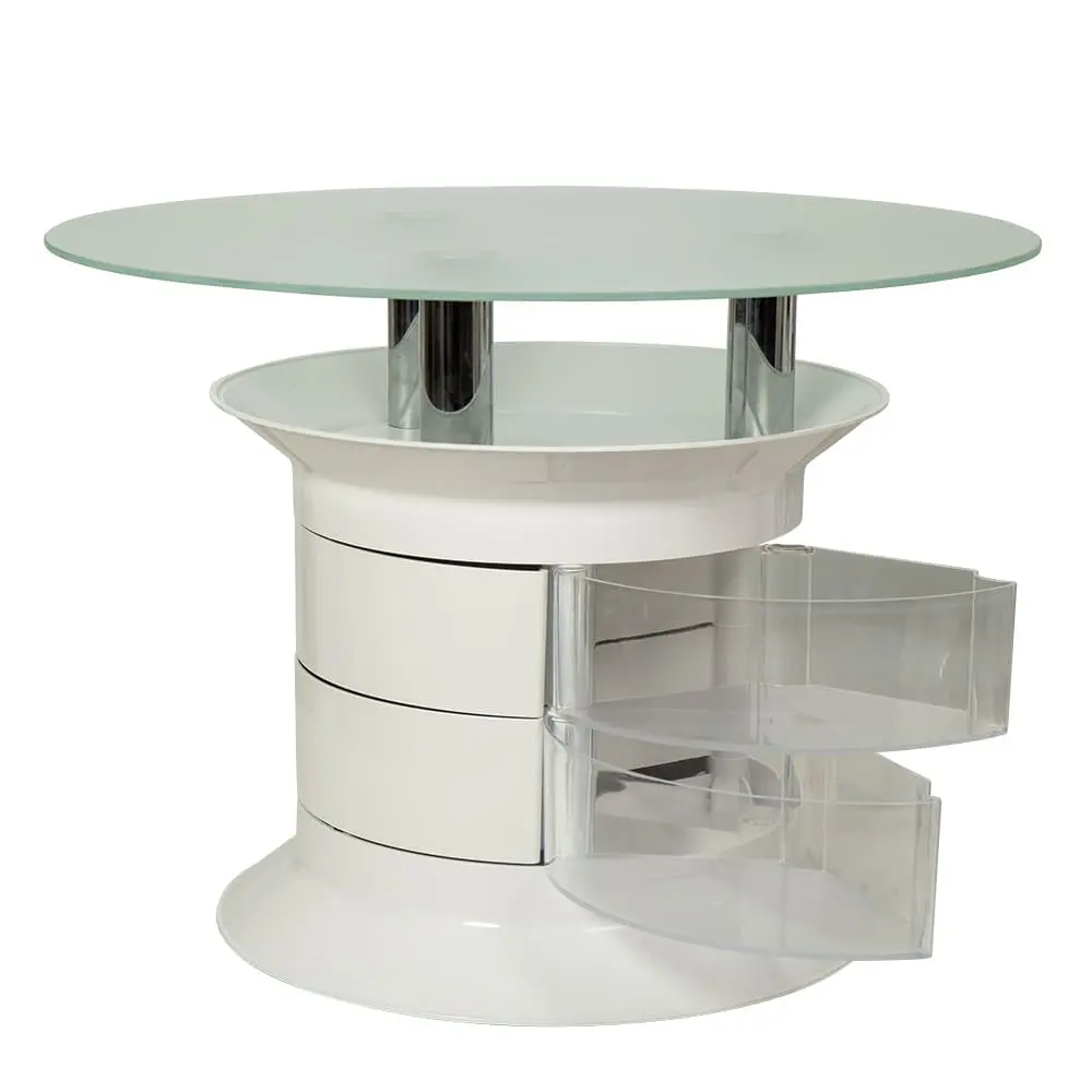 Журнальный столик GiroCo Benito Plus white – стильное и практичное оборудование для салона красоты. Необычный дизайн столика прекрасно дополнит интерьер. Под стеклянной столешницей предусмотрены вместительные ящички. Полочка над ящиками функциональна. Мебель для холла можно перемещать без особых усилий за счет маневренных колес.