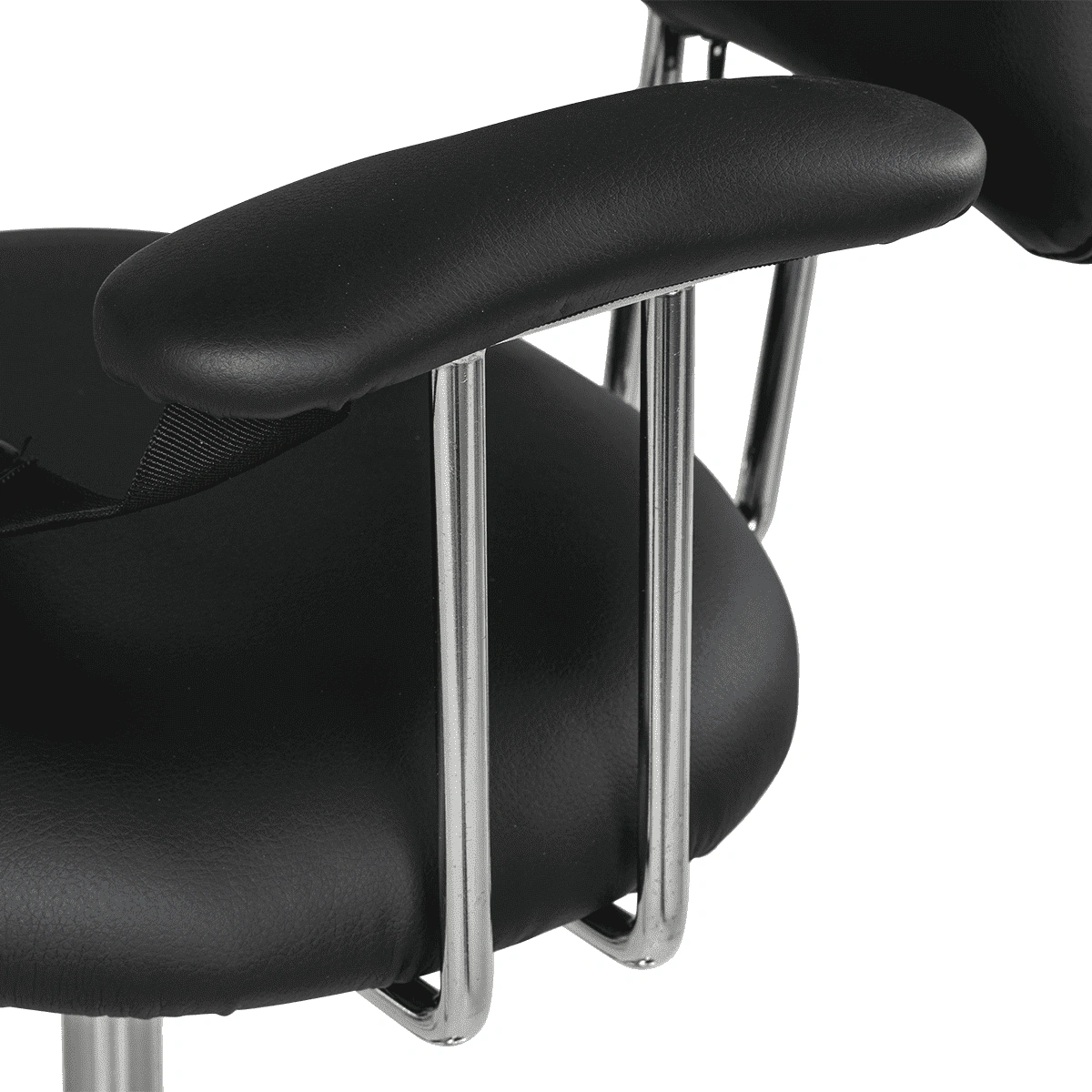 Каркас, подлокотники и ножная часть выполнены из прочной стали. Основание круглой формы имеет резиновую накладку, что предотвратит скольжение и сохранит напольное покрытие. Хромирование металлических элементов защитит от влияния коррозии и влаги.