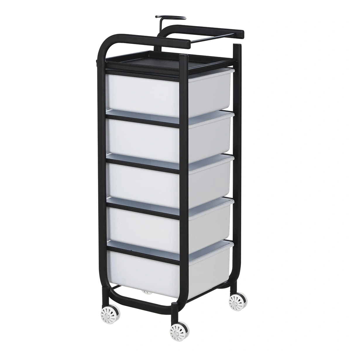 Для принадлежностей в парикмахерской тележке есть пять выдвижных закрытых ящиков, обеспечивающих защиту от влаги, пыли, волос и красящих элементов. Верхняя металлическая крышка — пространство для инструментов и баночек красоты, она позволит мастеру держать под рукой все необходимое во время работы с клиентом. Также модель оснащена фенодержателем.