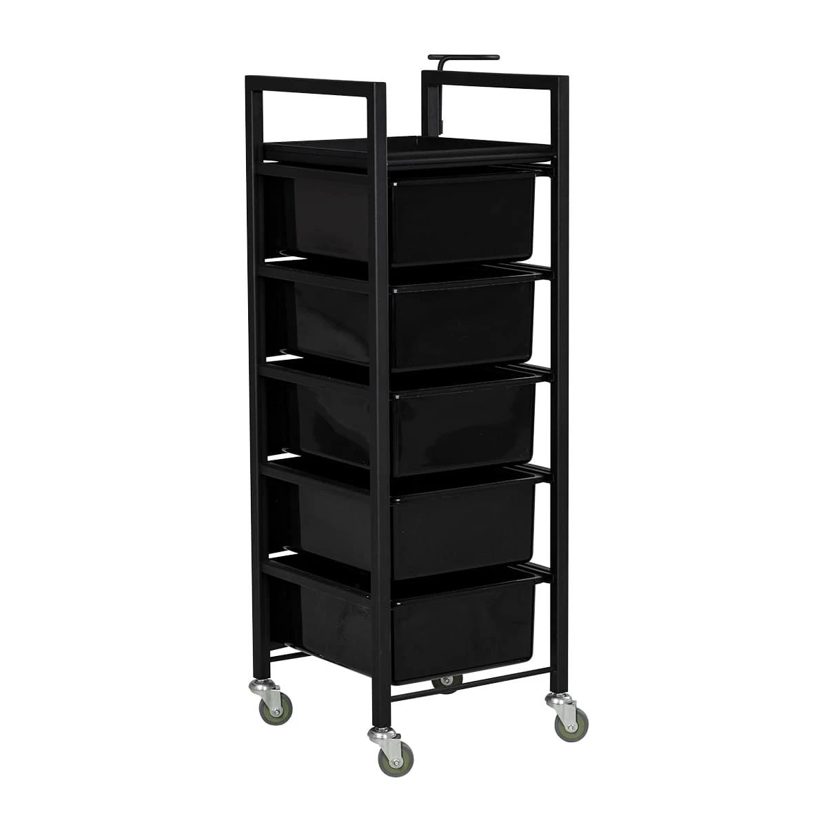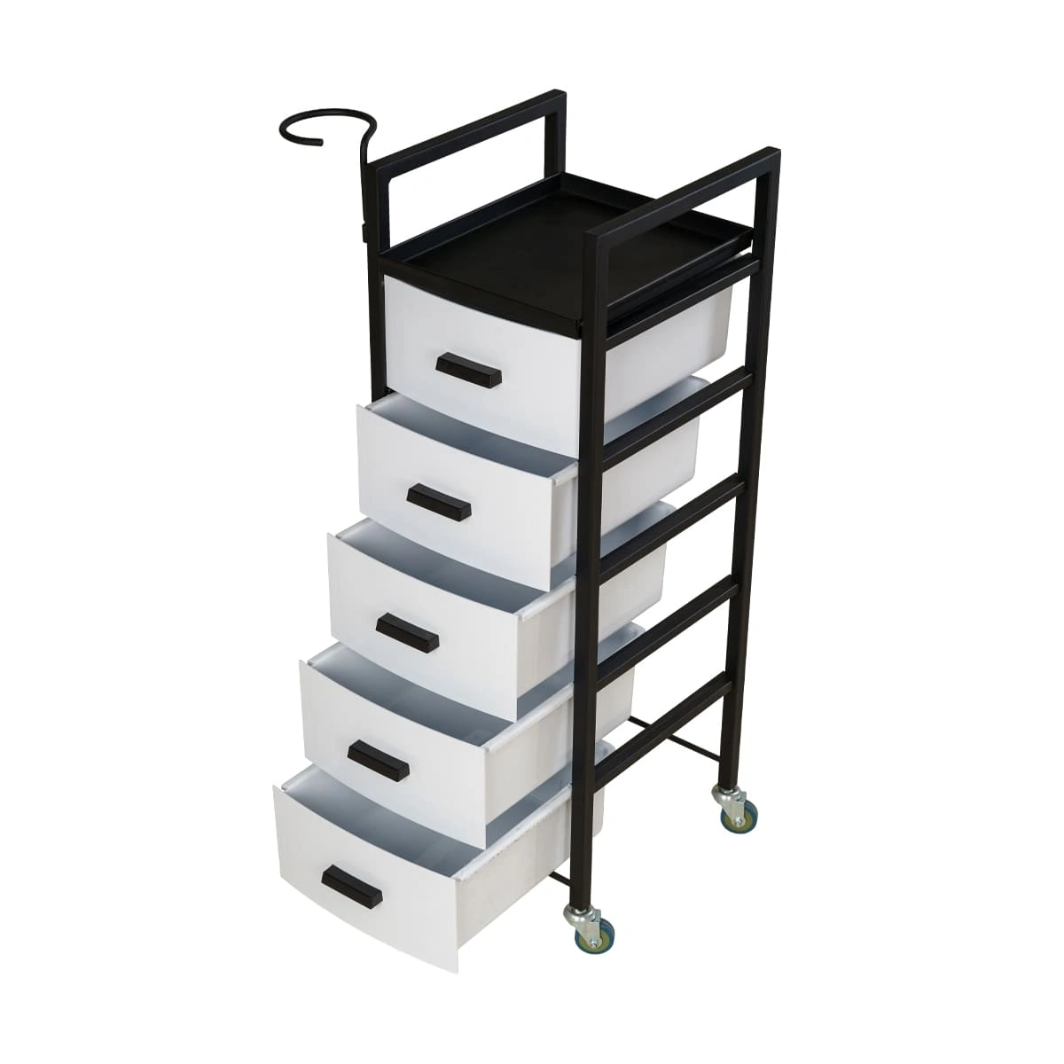 Для принадлежностей в парикмахерской тележке есть пять выдвижных ящиков. Верхняя полка позволит мастеру держать под рукой инструменты, необходимые во время работы с клиентом. На боковине установлен практичный фенодержатель. Вращающиеся колесики обеспечивают плавное и практически бесшумное перемещение оборудования в пределах рабочей зоны.