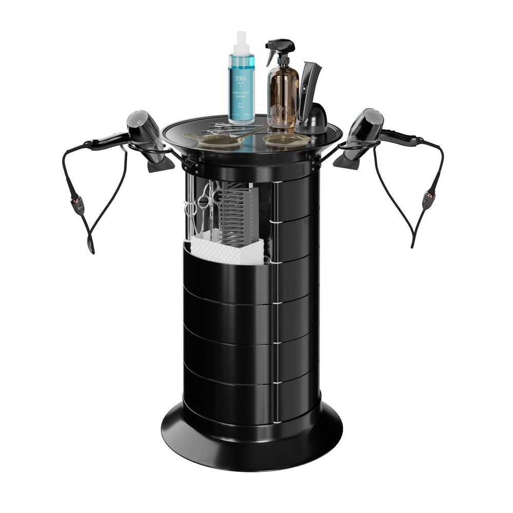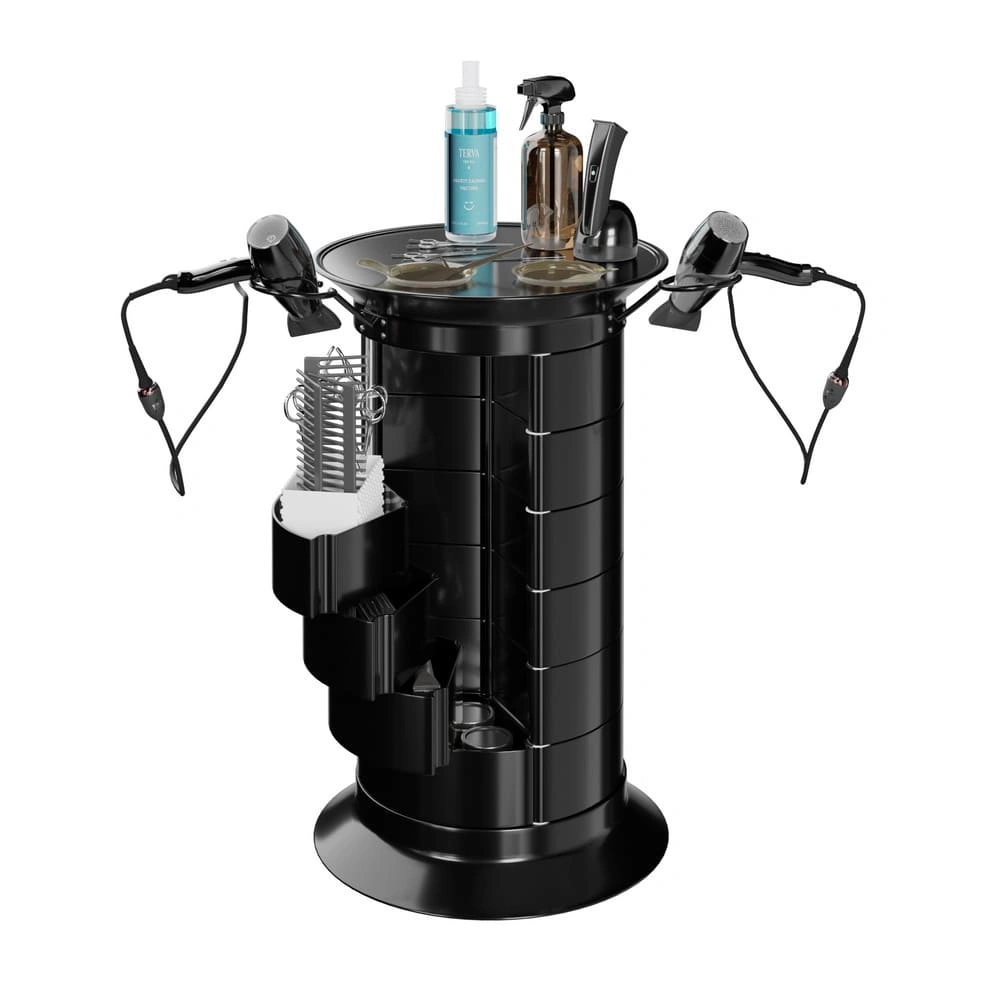 Продуманная конструкция позволит мастеру хранить все свои приспособления в одном месте. В распоряжении специалиста 16 раздвижных ящичков, которые поворачиваются вокруг стоек каркаса. Чтобы в тумбе можно было поставить высокие сосуды, с одной стороны отсутствует два ящика. Верхняя полка имеет специальные отверстия, предназначенные для емкостей и чаш. С двух сторон крышка оборудована держателями для фенов. Мобильность мебели обеспечивается шестью поворотными колесиками. Тележка может быть использована для обстановки двух рабочих мест.