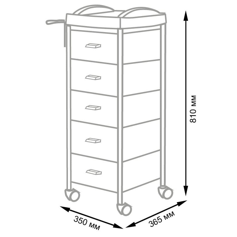 Для инструментов и расходных материалов в парикмахерской тележке есть пять вместительных ящиков. На верхней полке удобно поставить приспособления, используемые в работе. На боковой стене есть удобный держатель для фена.  Легкое и бесшумное перемещение обеспечено маневренными колесами.