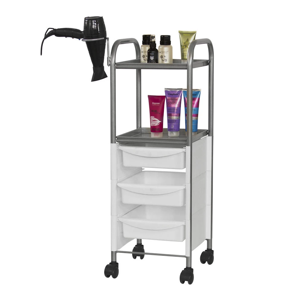 Комплектация: основа на маневренных колесиках, боковые панели, три ящичка, 2 полочки, держатель для фена.