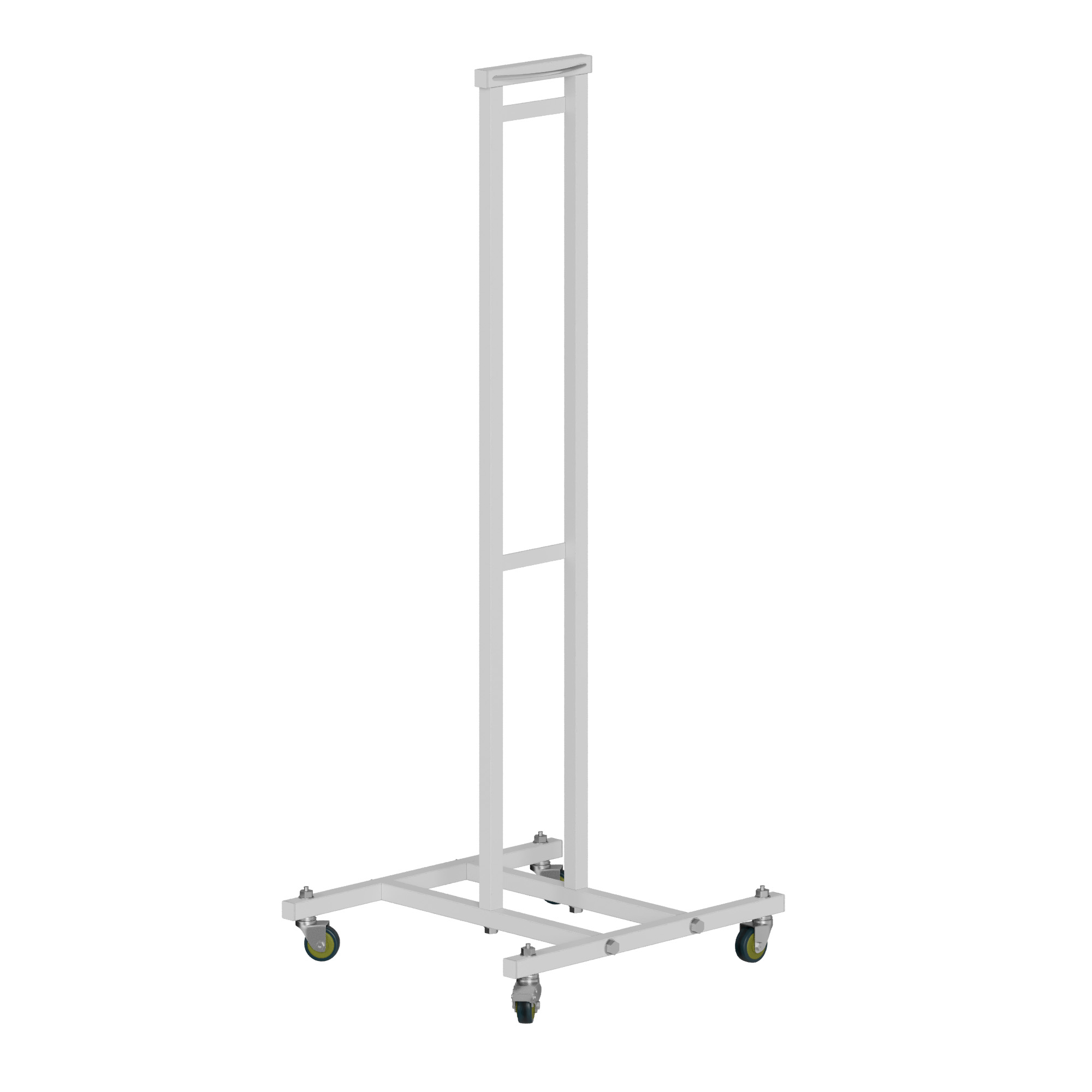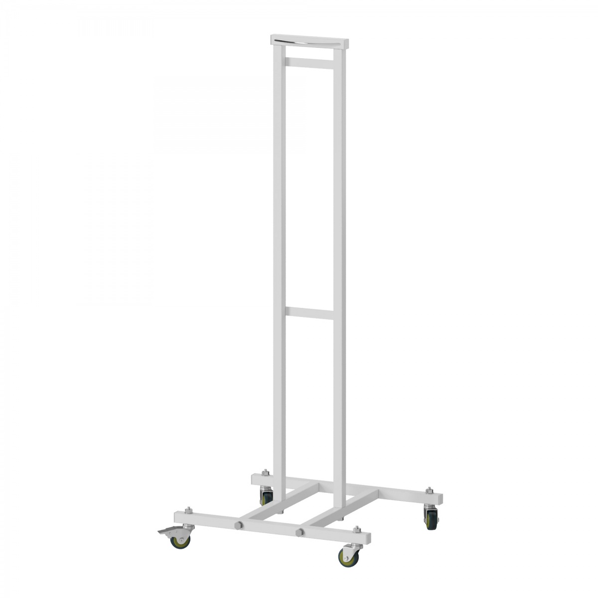 Передвижная подставка содержит четыре резиновых колёсика для перемещения по поверхности пола. Для фиксации подставки передвижной колёса снабжены специальным тормозным устройством. Подставка выполнена из профильной стальной трубы 20х20 мм и покрыта химически стойким порошковым покрытием. При необходимости подставка может легко разбираться и размещаться в небольшом объёме.