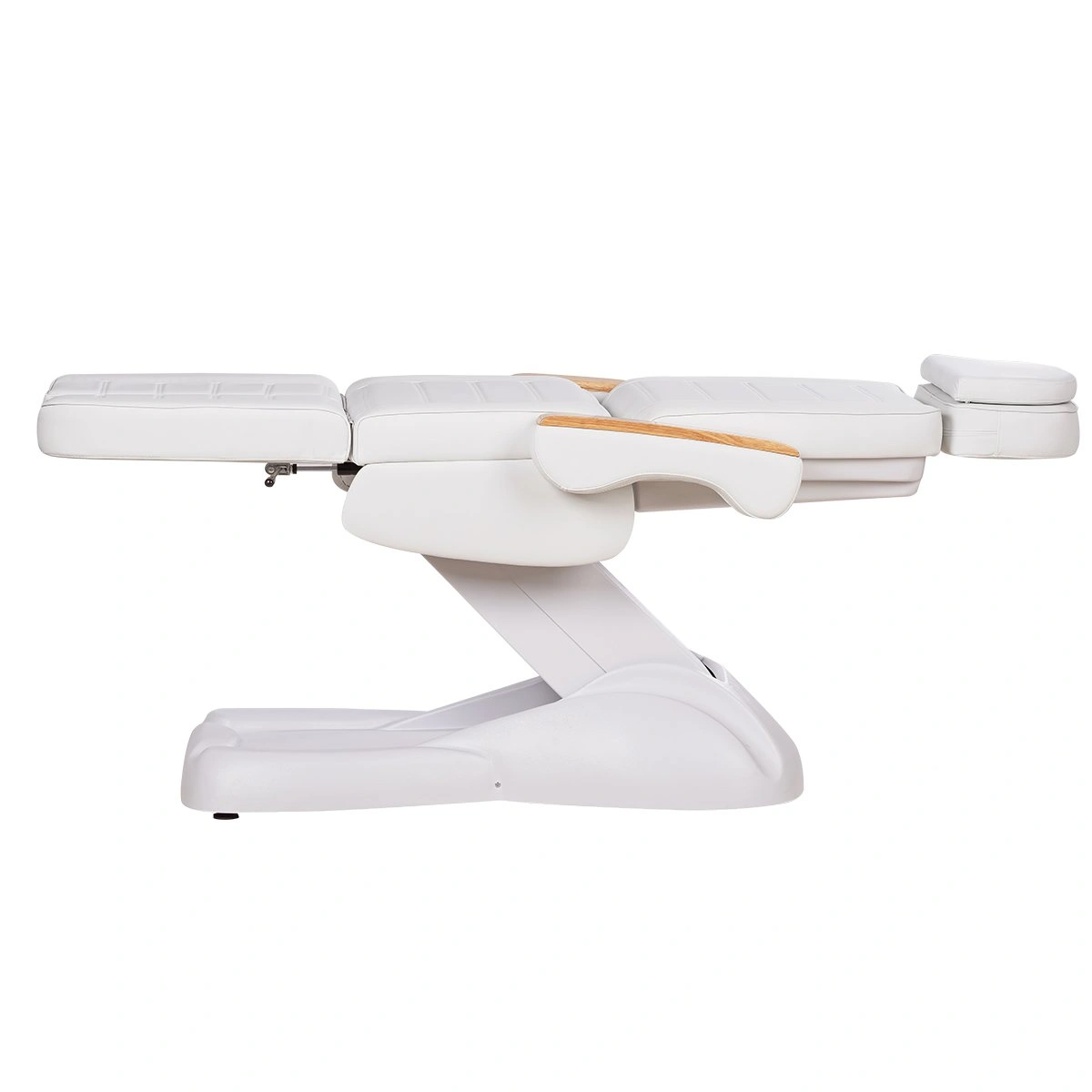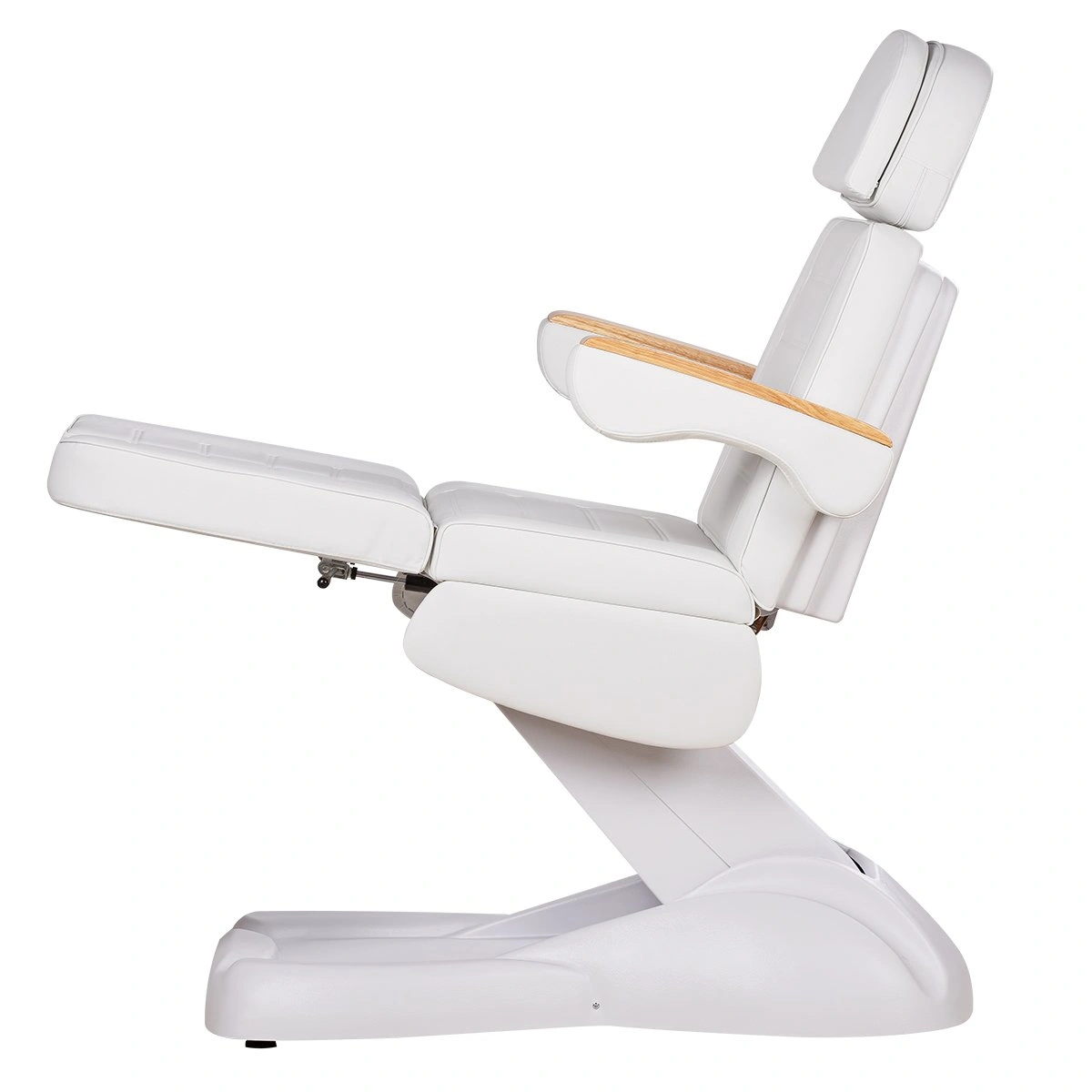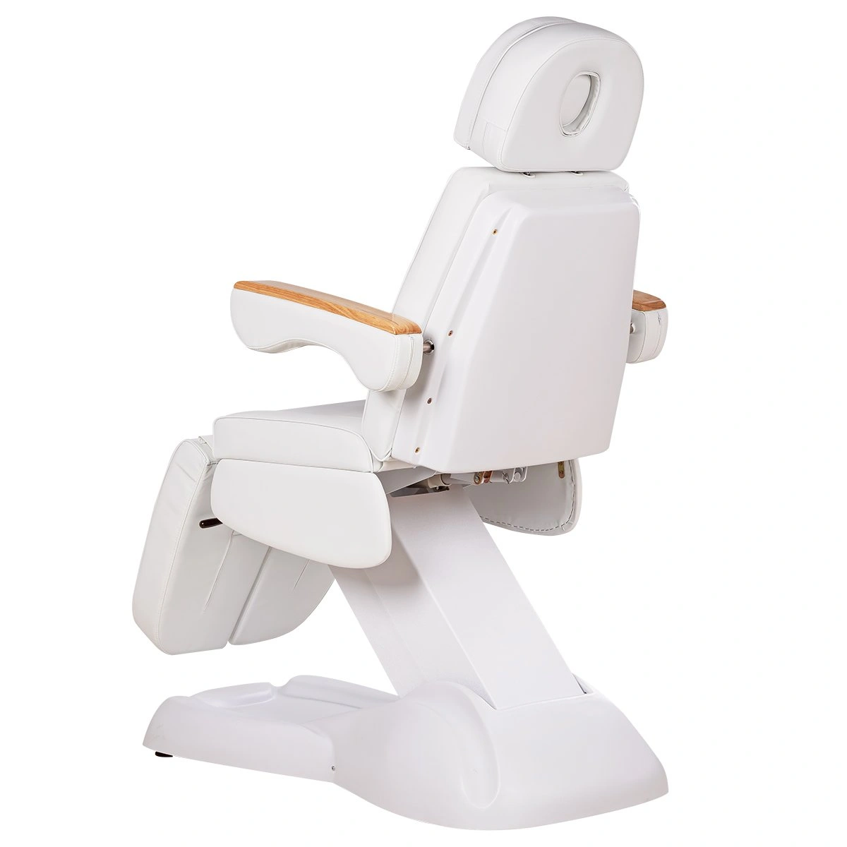 Кресло имеет устойчивое широкое основание, конструкция полностью раскладывается в горизонтальное положение, имеются выдвижной подголовник с отверстием для лица, которое при необходимости можно закрыть мягкой подушкой и съёмные подлокотники со стильными деревянными вставками. Модель можно использовать для различных процедур: педикюр, наращивание ресниц, косметология, оформление бровей и т.д.