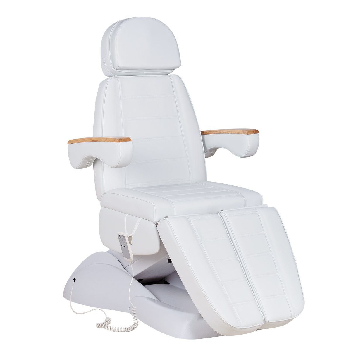 Кресло имеет устойчивое широкое основание, конструкция полностью раскладывается в горизонтальное положение, имеются выдвижной подголовник с отверстием для лица, которое при необходимости можно закрыть мягкой подушкой и съёмные подлокотники со стильными деревянными вставками. Модель можно использовать для различных процедур: педикюр, наращивание ресниц, косметология, оформление бровей и т.д.