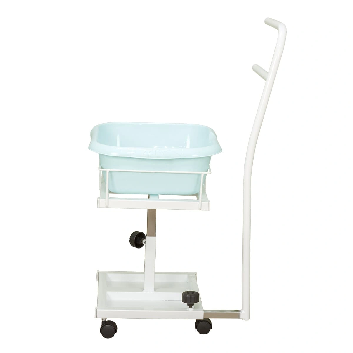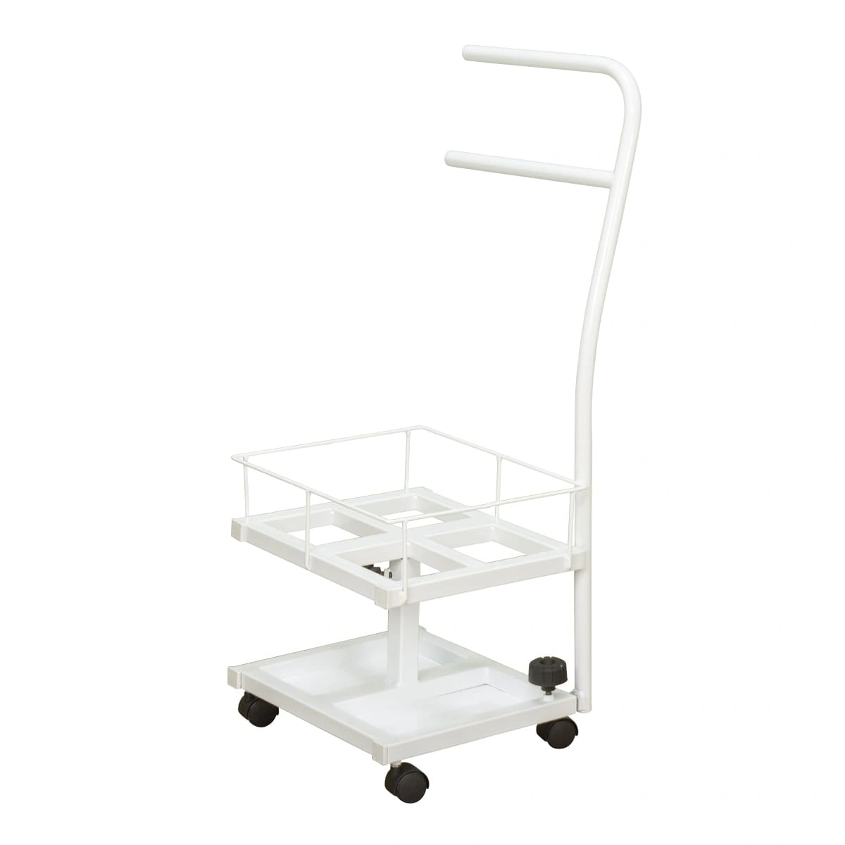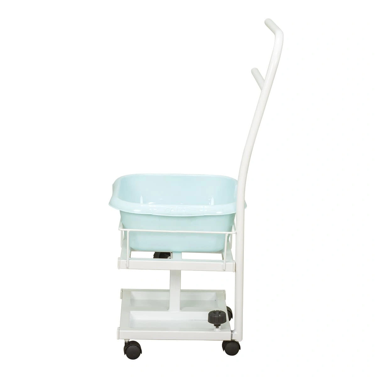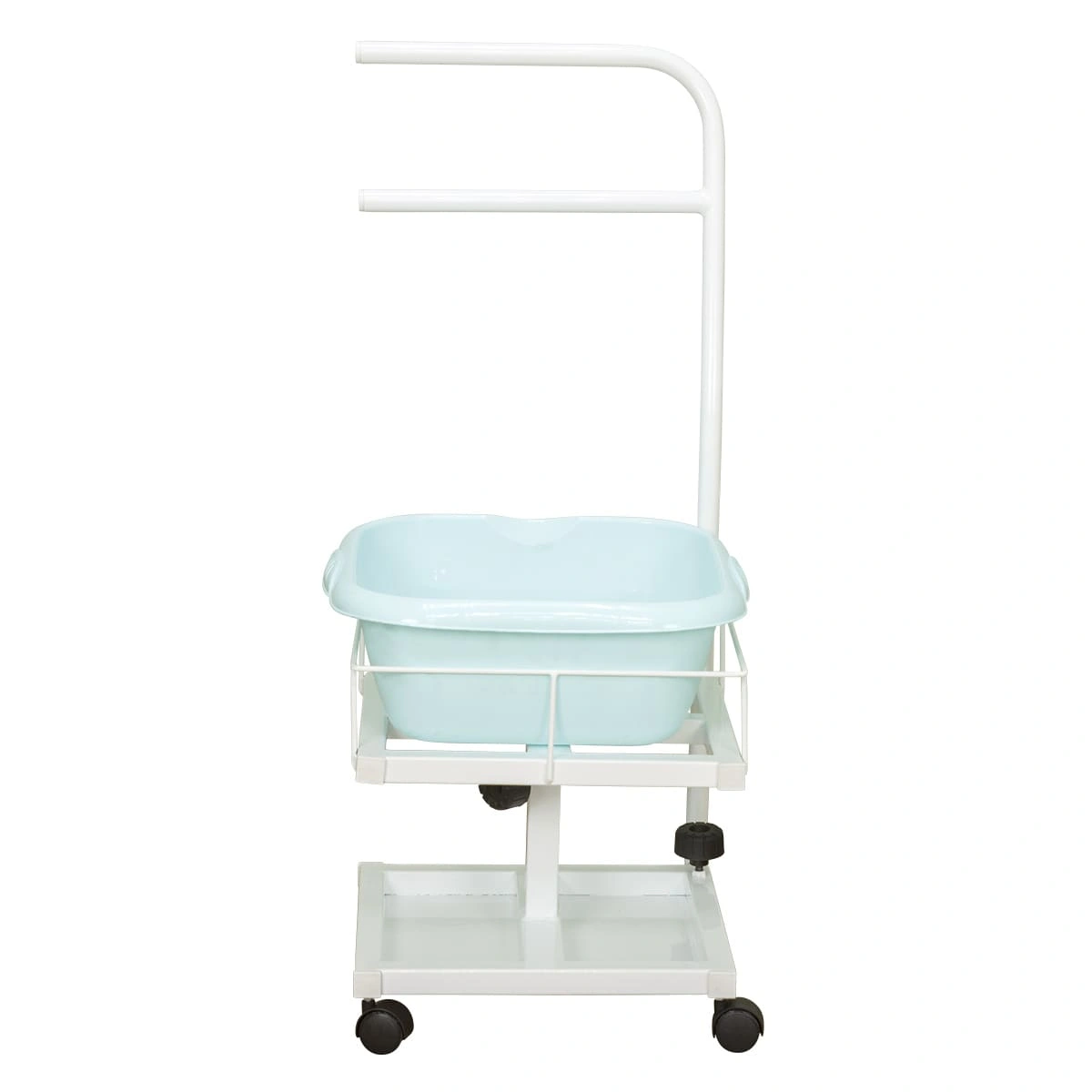 Благодаря двухъярусной конструкции можно установить не только ванную, но также необходимые инструменты и приспособления. Ванночка снимается для чистки и дезинфекции. Удобную ручку можно использовать как для перемещения педикюрного оборудования, так и для развешивания полотенец. Встроенные колеса обеспечивают маневренность и бесшумность передвижения по любому типу напольного покрытия.