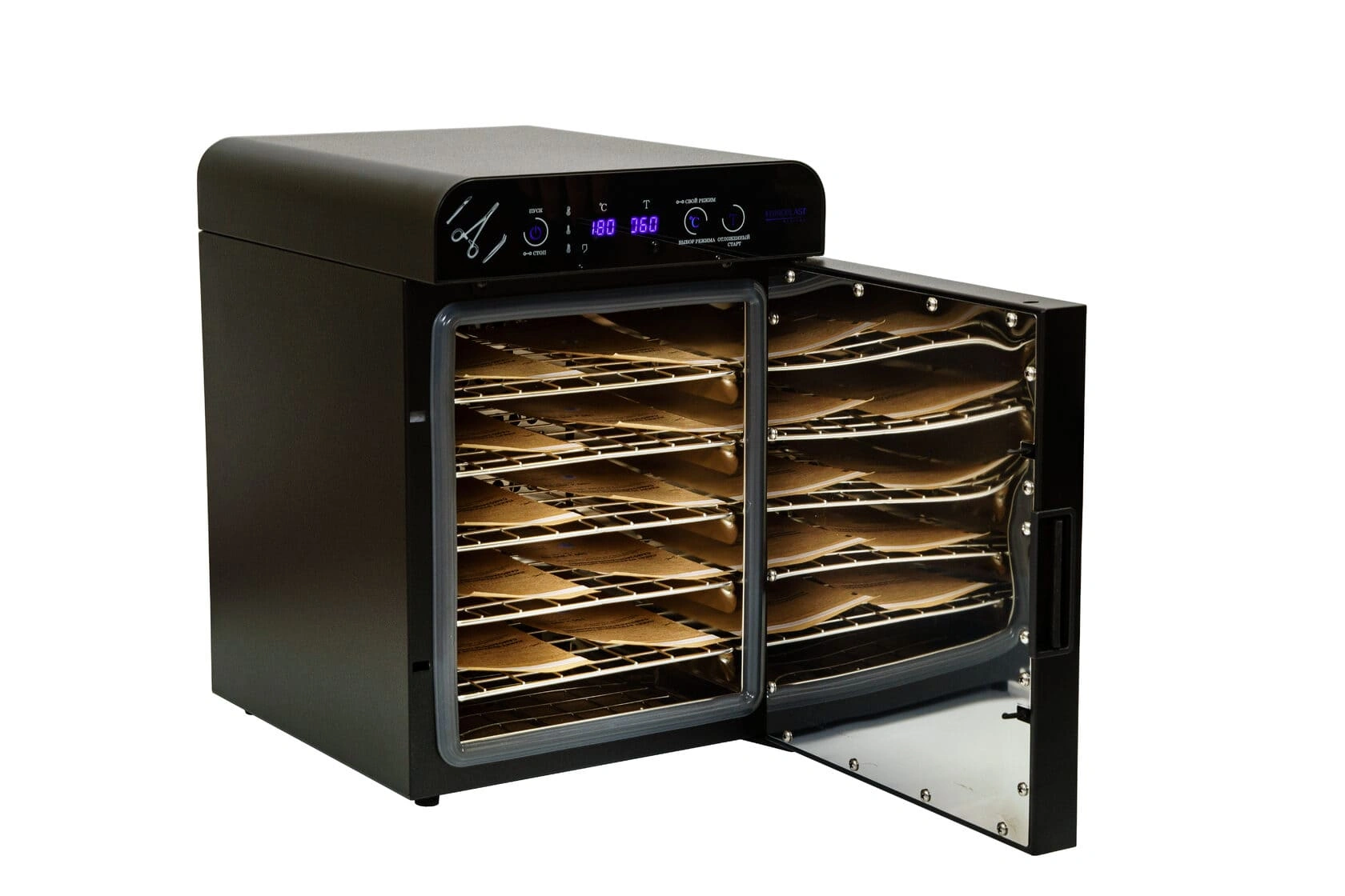 Стильный и современный стерилизатор с сенсорной панелью управления, блокировкой дверцы в режиме работы и стеклянной вставкой. Стерилизационная камера разработана методом компьютерного моделирования, с целью достижения максимального нагнетания воздуха, что позволяет располагать инструмент в стерилизационной камере на 5 полочках одновременно. Предусмотрены режимы работы для дезинфекции и сушки косметологического инструмента и термостойких принадлежностей.